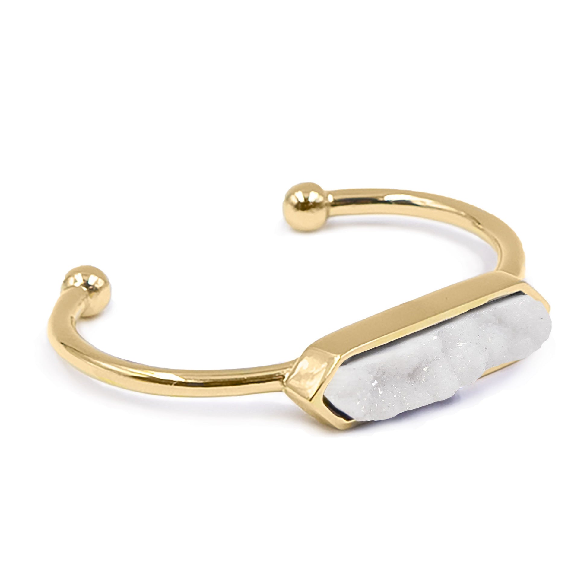 Gold And White Hypoallergenic Nickel Free Bangle Cuff Bracelet. Custom Druzy Raw Natural Quartz Stone Accents And Designed With Love In Texas. Size Small, Medium, Large, and Extra Large Ranging From 6.25 - 7.25 Inch Circumference With Custom Sizing Available On Select Pieces.