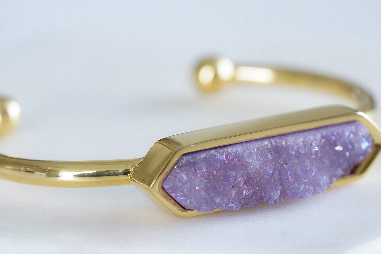 Gold And Purple Hypoallergenic Nickel Free Bangle Cuff Bracelet. Custom Druzy Raw Natural Quartz Stone Accents And Designed With Love In Texas. Size Small, Medium, Large, and Extra Large Ranging From 6.25 - 7.25 Inch Circumference With Custom Sizing Available On Select Pieces.