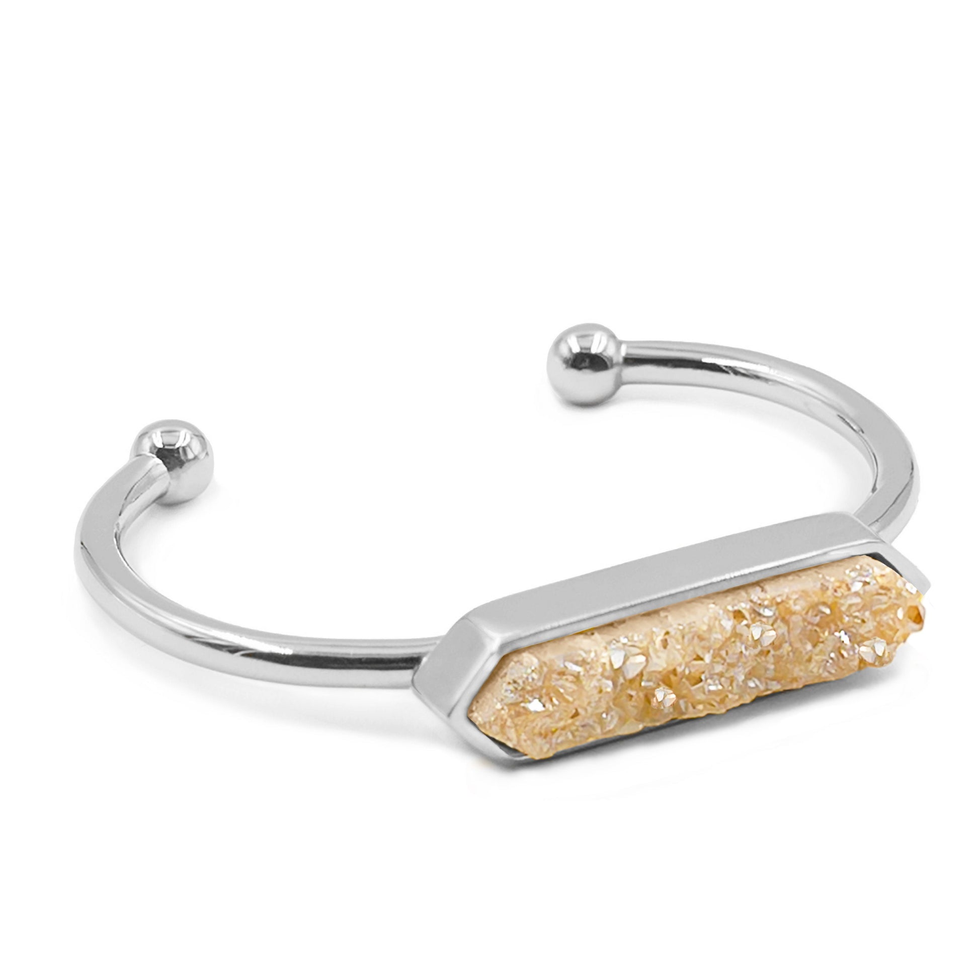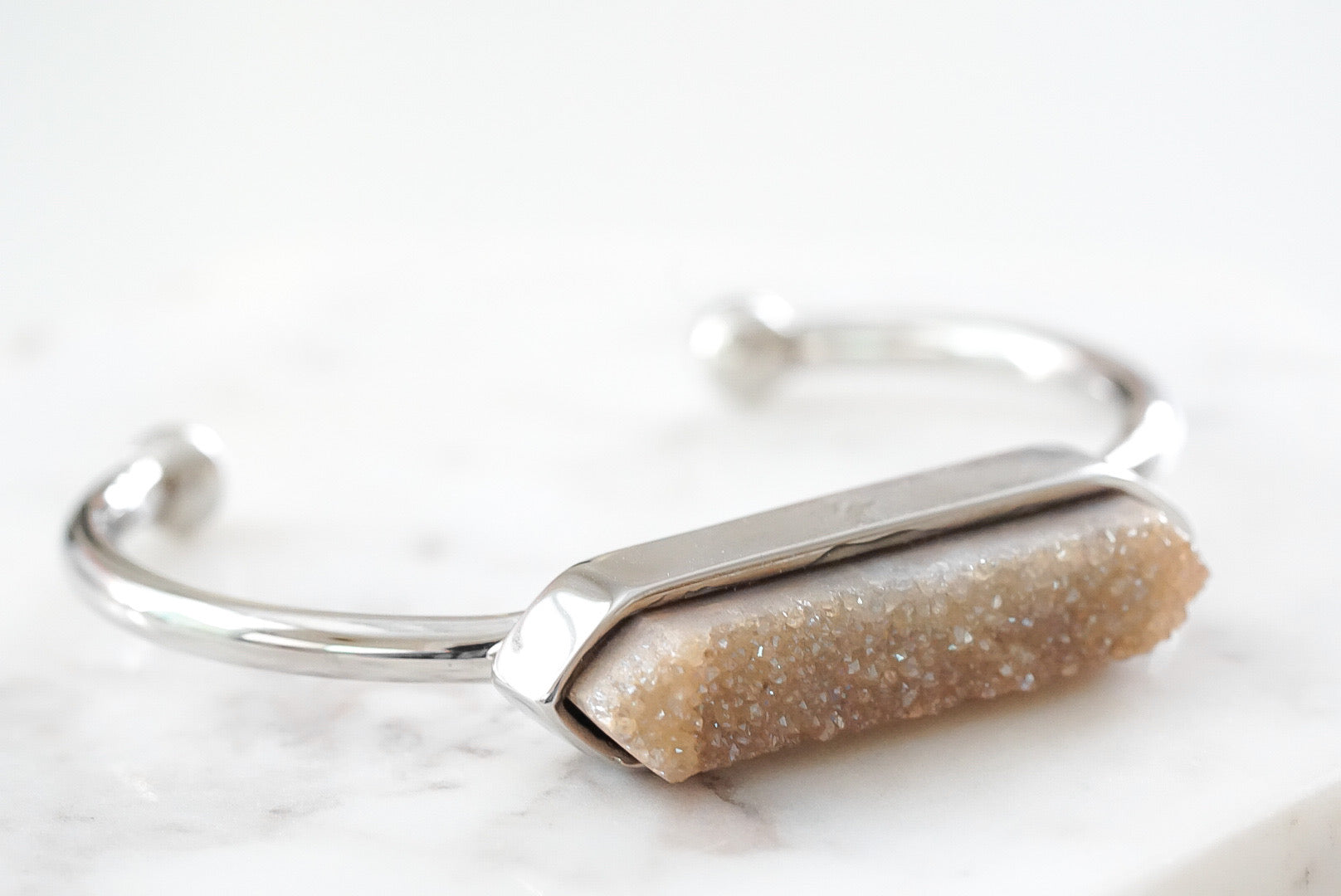 Silver And Brown Hypoallergenic Nickel Free Bangle Cuff Bracelet. Custom Druzy Raw Natural Quartz Stone Accents And Designed With Love In Texas. Size Small, Medium, Large, and Extra Large Ranging From 6.25 - 7.25 Inch Circumference With Custom Sizing Available On Select Pieces.