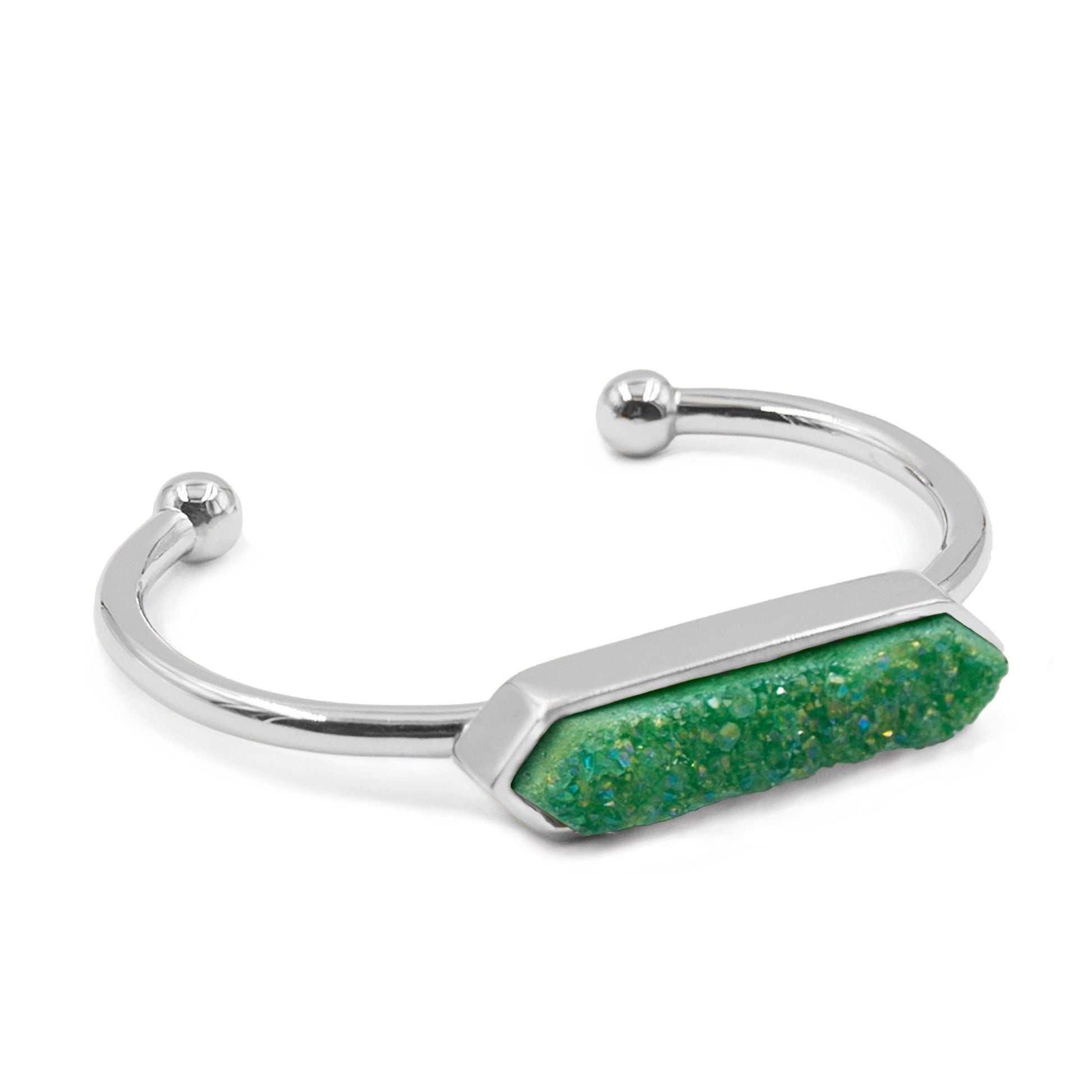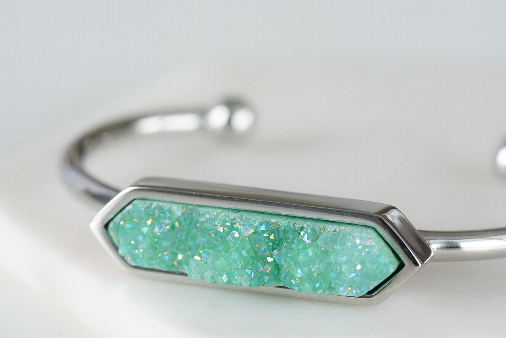 Silver And Green Hypoallergenic Nickel Free Bangle Cuff Bracelet. Custom Druzy Raw Natural Quartz Stone Accents And Designed With Love In Texas. Size Small, Medium, Large, and Extra Large Ranging From 6.25 - 7.25 Inch Circumference With Custom Sizing Available On Select Pieces.