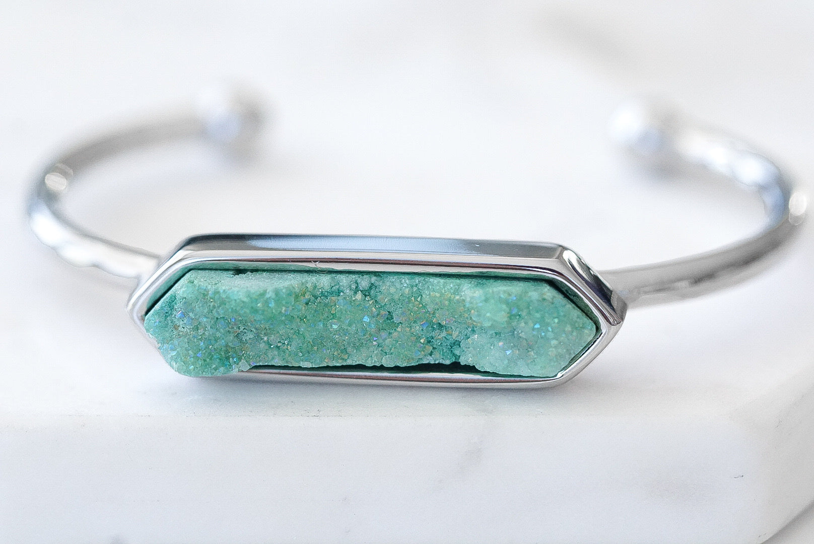 Silver And Green Hypoallergenic Nickel Free Bangle Cuff Bracelet. Custom Druzy Raw Natural Quartz Stone Accents And Designed With Love In Texas. Size Small, Medium, Large, and Extra Large Ranging From 6.25 - 7.25 Inch Circumference With Custom Sizing Available On Select Pieces.