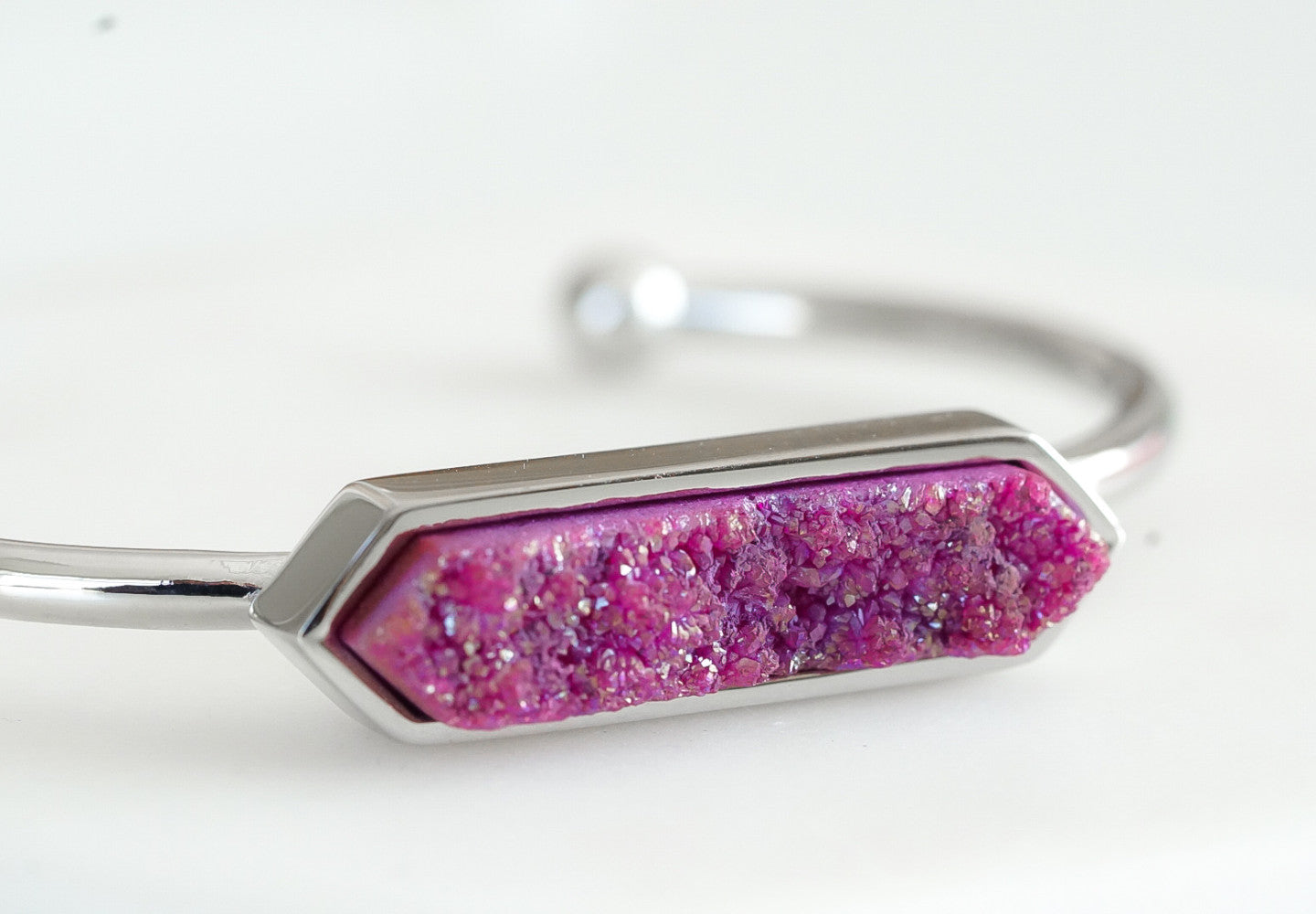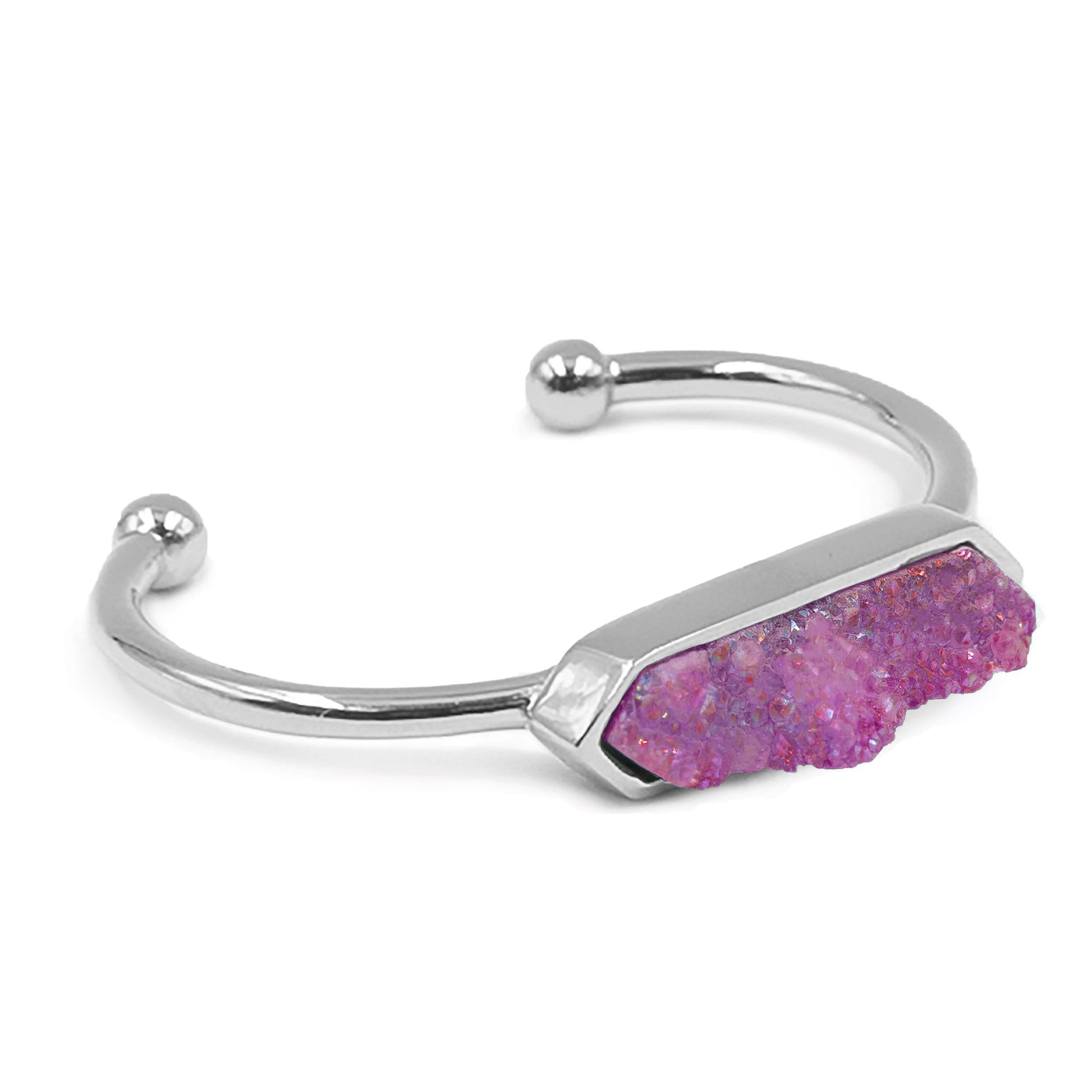 Silver And Purple Hypoallergenic Nickel Free Bangle Cuff Bracelet. Custom Druzy Raw Natural Quartz Stone Accents And Designed With Love In Texas. Size Small, Medium, Large, and Extra Large Ranging From 6.25 - 7.25 Inch Circumference With Custom Sizing Available On Select Pieces.