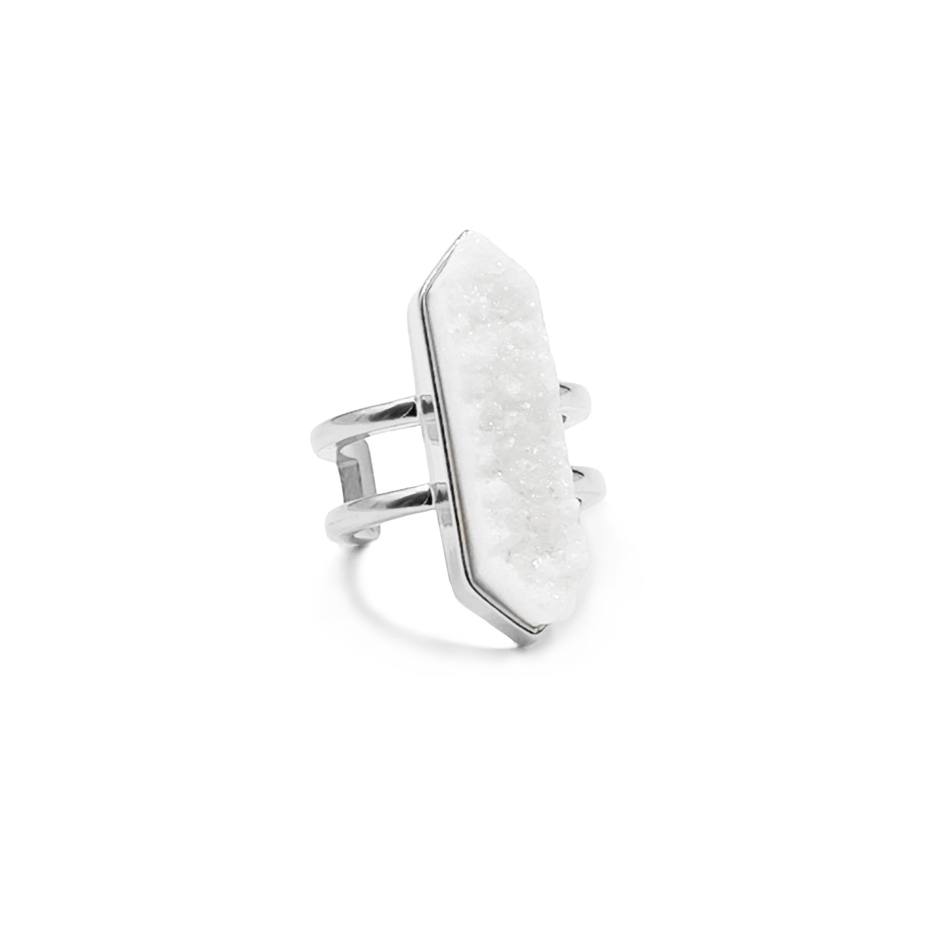 Silver And White Hypoallergenic Nickel Free Statement Cuff Ring. Custom Druzy Raw Natural Quartz Stone Accents And Designed With Love In Texas. Size 5 - 10 With Custom Sizing Available On Select Pieces.