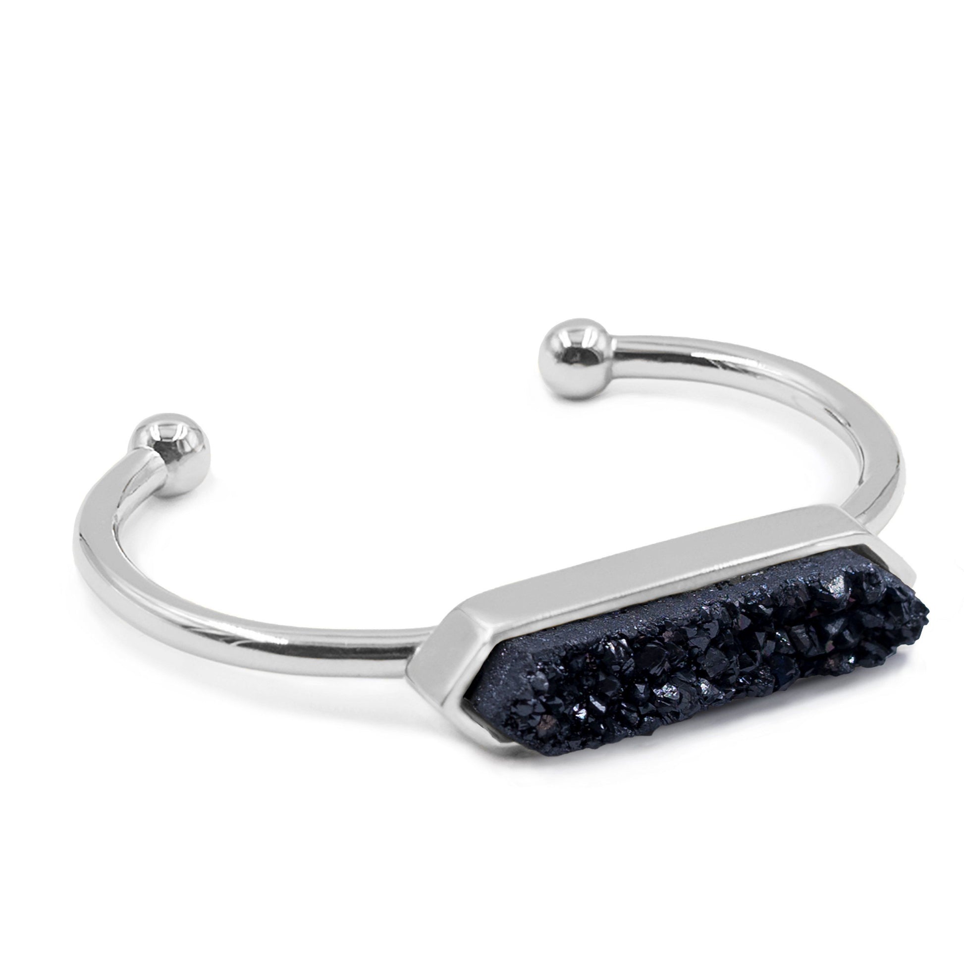 Silver And Black Hypoallergenic Nickel Free Bangle Cuff Bracelet. Custom Druzy Raw Natural Quartz Stone Accents And Designed With Love In Texas. Size Small, Medium, Large, and Extra Large Ranging From 6.25 - 7.25 Inch Circumference With Custom Sizing Available On Select Pieces.
