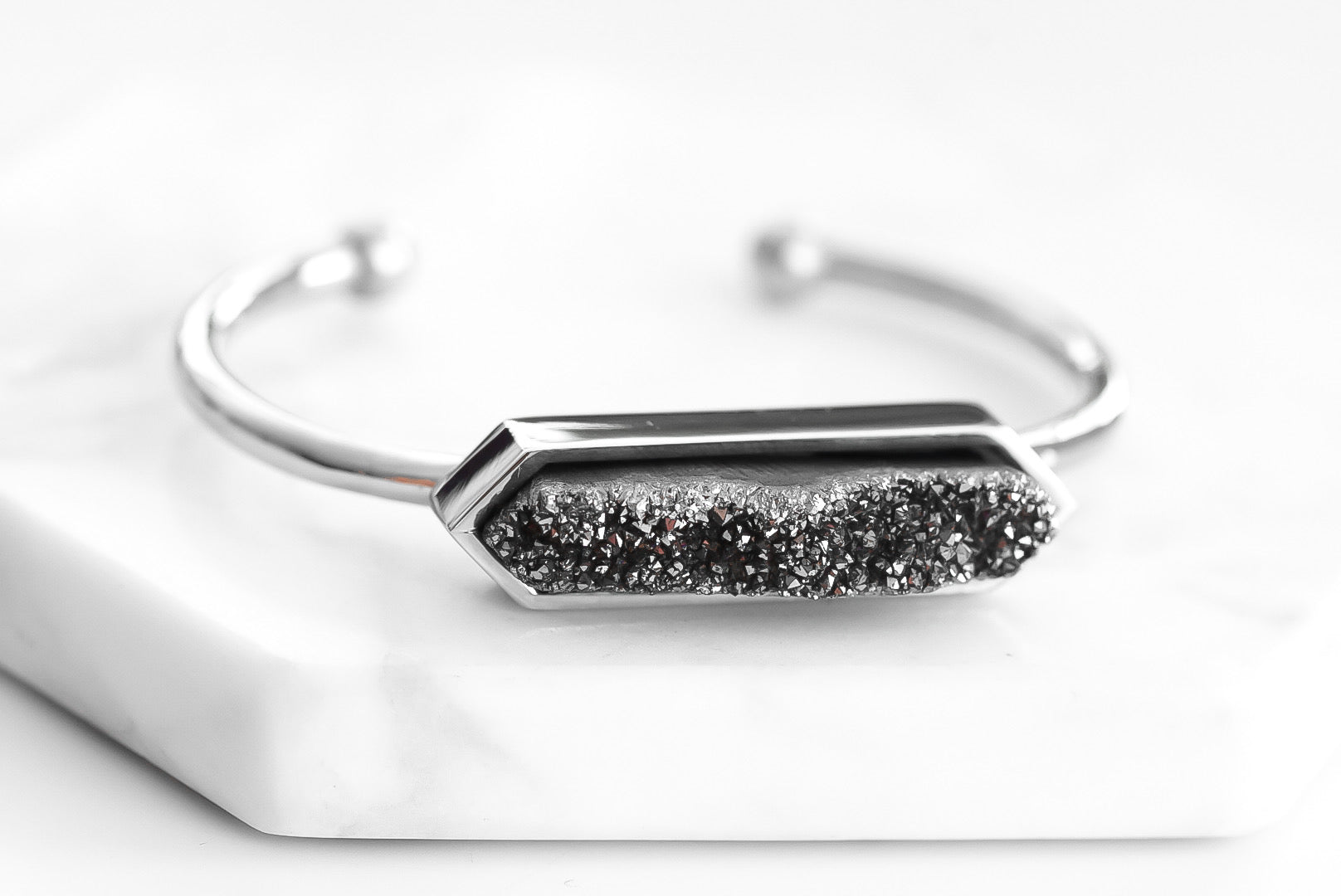 Silver And Black Hypoallergenic Nickel Free Bangle Cuff Bracelet. Custom Druzy Raw Natural Quartz Stone Accents And Designed With Love In Texas. Size Small, Medium, Large, and Extra Large Ranging From 6.25 - 7.25 Inch Circumference With Custom Sizing Available On Select Pieces.
