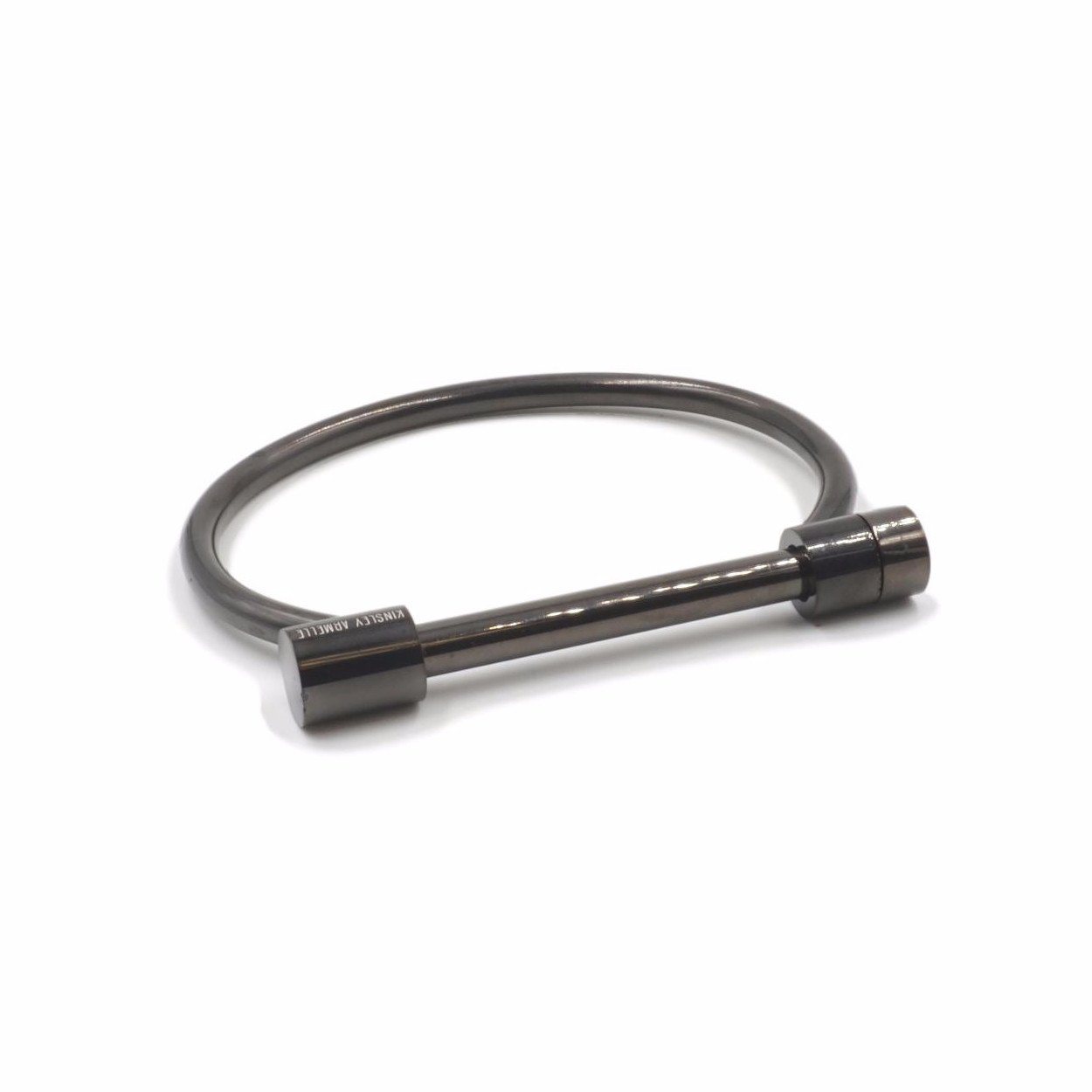 Black Screw Hypoallergenic Nickel Free All Metal Bangle Cuff Bracelet. Custom Black Ion Plated Stainless Steel Locking Bar Accents And Designed With Love In Texas. Size Small, Medium, Large, and Extra Large Ranging From 6.25 - 7.25 Inch Circumference With Custom Sizing Available On Select Pieces.