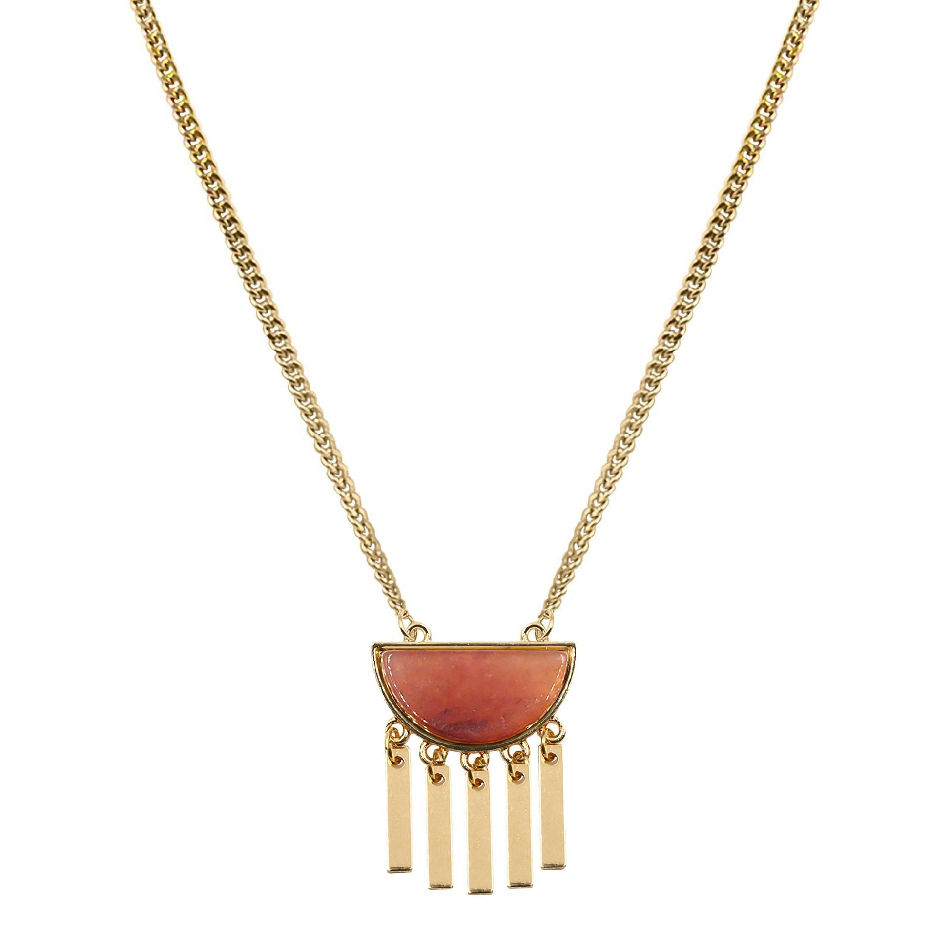 Gold And Orange Aztec Bar Fringe Tassel Hypoallergenic Nickel Free Pendant Necklace. Custom Aragonite Raw Natural Stone Accents And Designed With Love In Texas. Size 18, 22, or 26 Inch Length, Plus 3 Inch Attached Necklace Extender With Custom Sizing Available On Select Pieces.
