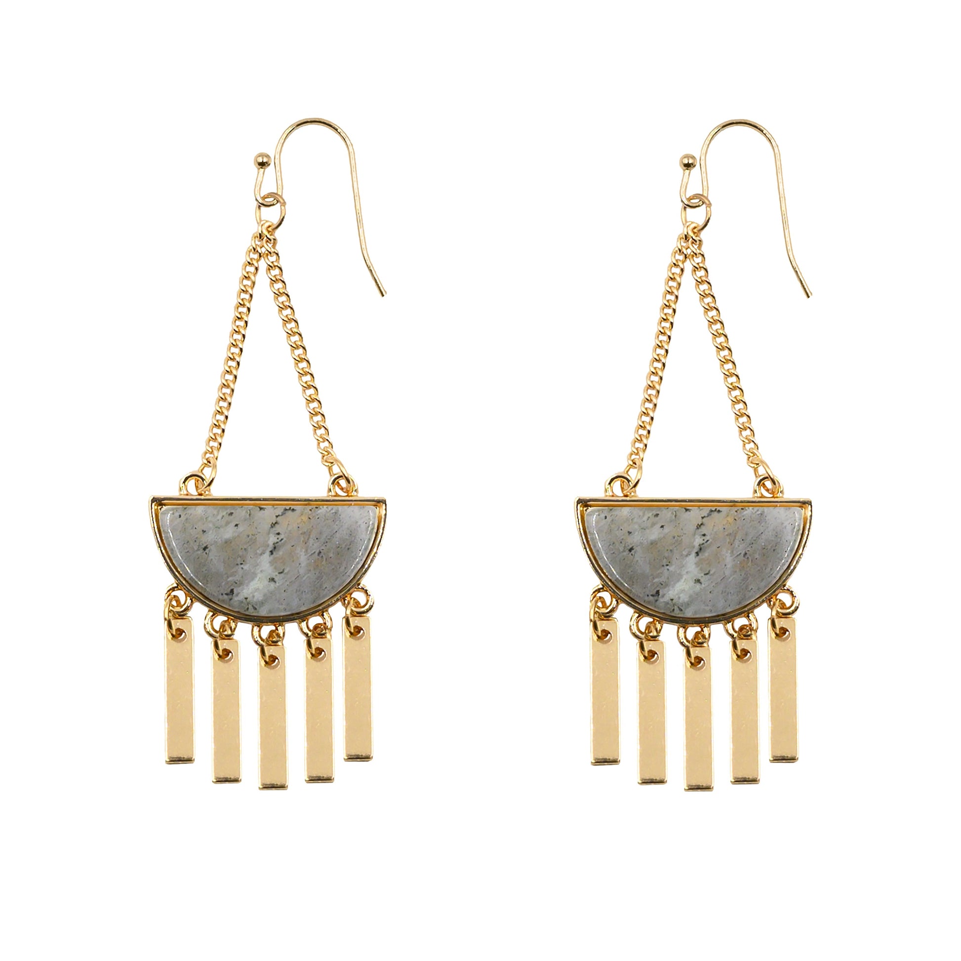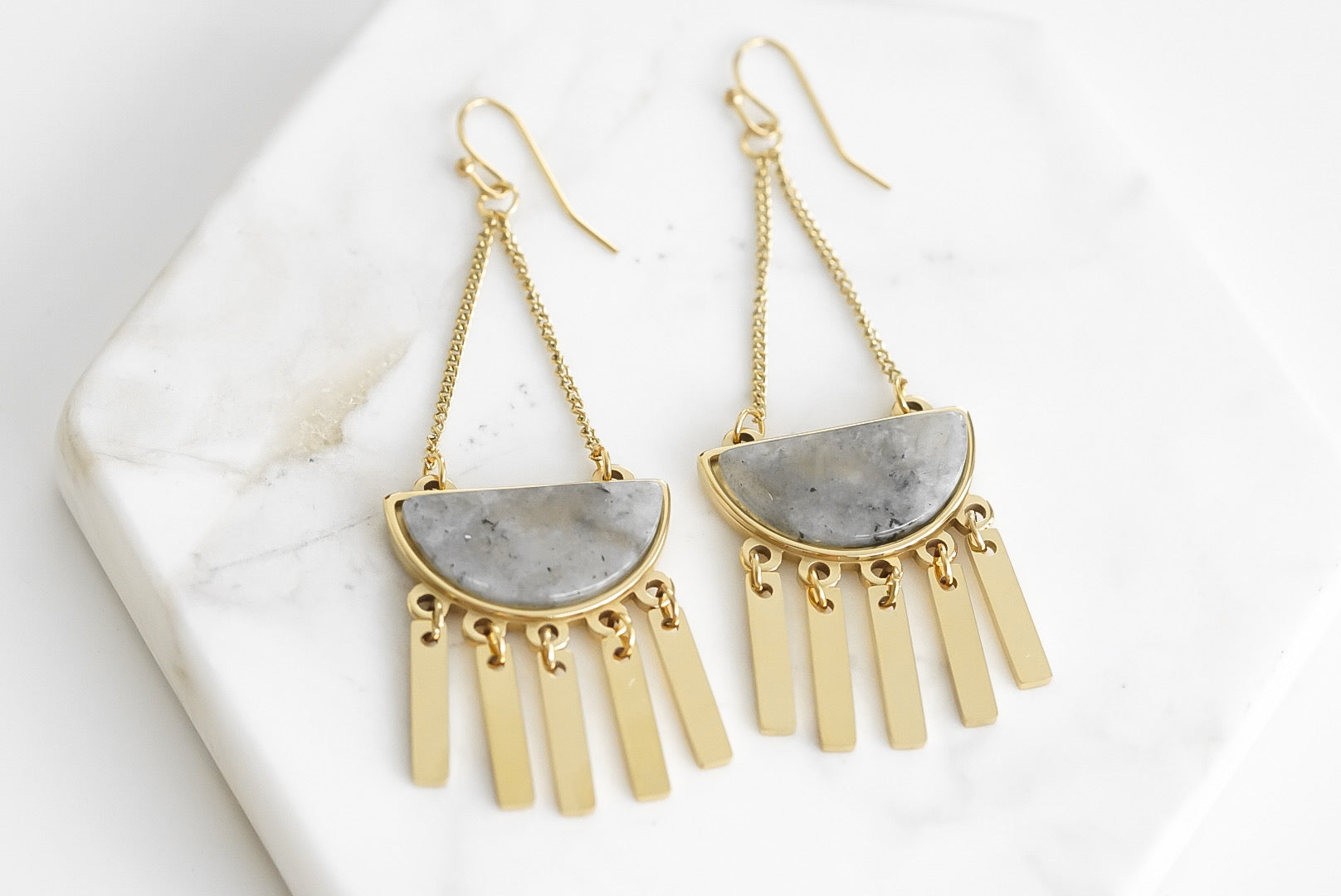 Gold And Green Aztec Bar Fringe Tassel Mediumweight Hypoallergenic Nickel Free Statement Drop Earrings. Custom Labradorite Raw Natural Stone Accents And Designed With Love In Texas. Size 3 Inch Length x 1 Inch Width With Custom Sizing Available On Select Pieces.