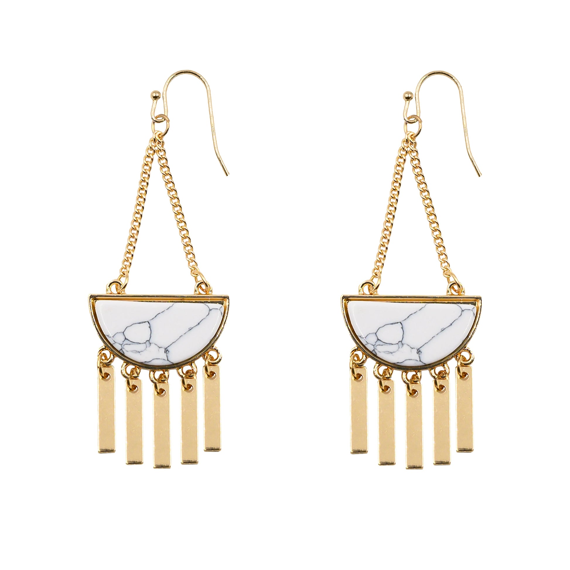 Gold And White Aztec Bar Fringe Marble Tassel Mediumweight Hypoallergenic Nickel Free Statement Drop Earrings. Custom Howlite Raw Natural Stone Accents And Designed With Love In Texas. Size 3 Inch Length x 1 Inch Width With Custom Sizing Available On Select Pieces.