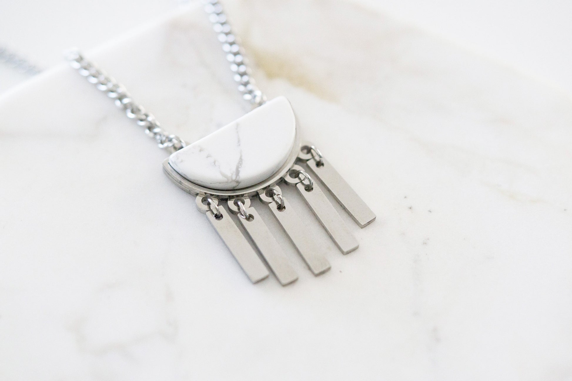 Silver And White Aztec Bar Fringe Marble Tassel Hypoallergenic Nickel Free Pendant Necklace. Custom Howlite Raw Natural Stone Accents And Designed With Love In Texas. Size 18, 22, or 26 Inch Length, Plus 3 Inch Attached Necklace Extender With Custom Sizing Available On Select Pieces.