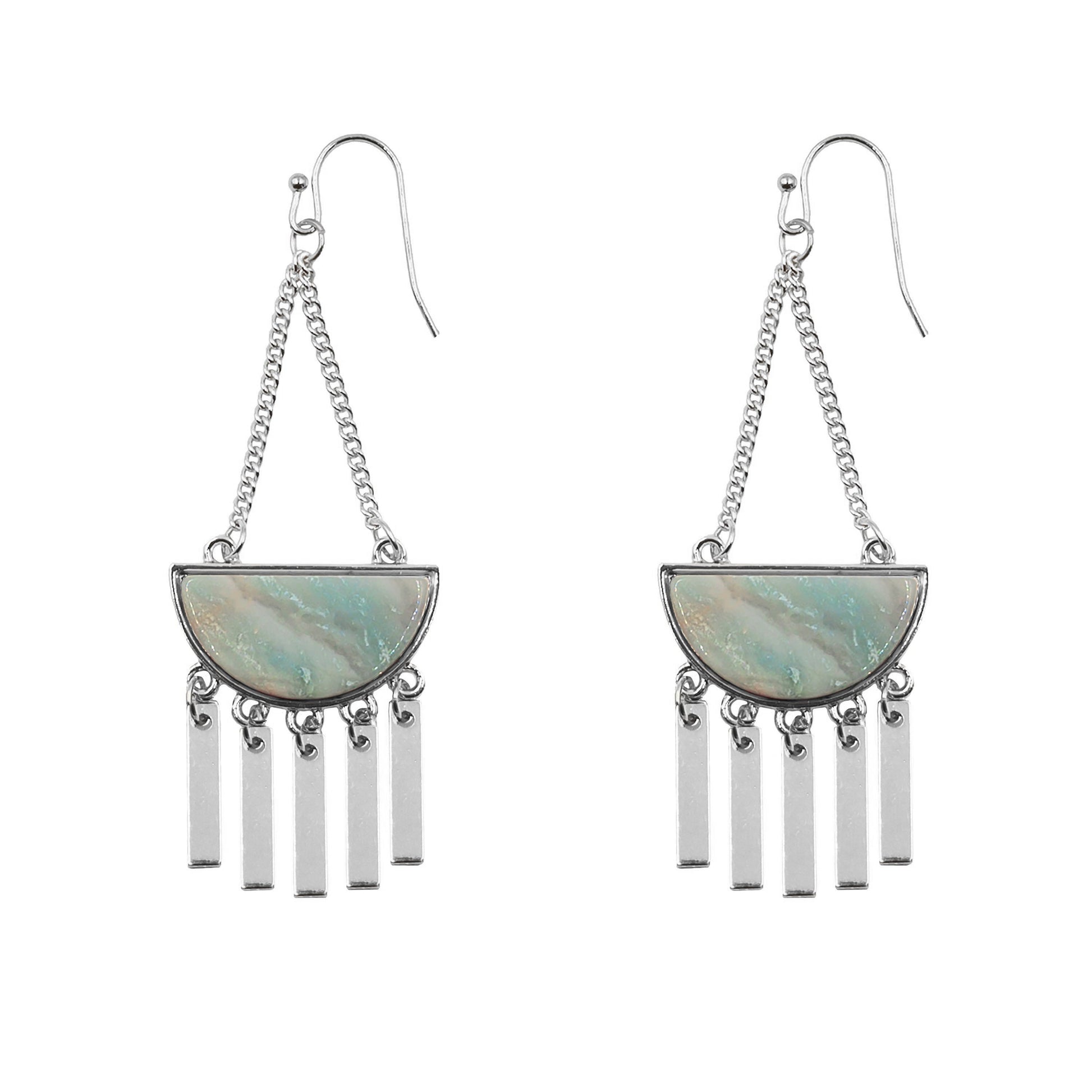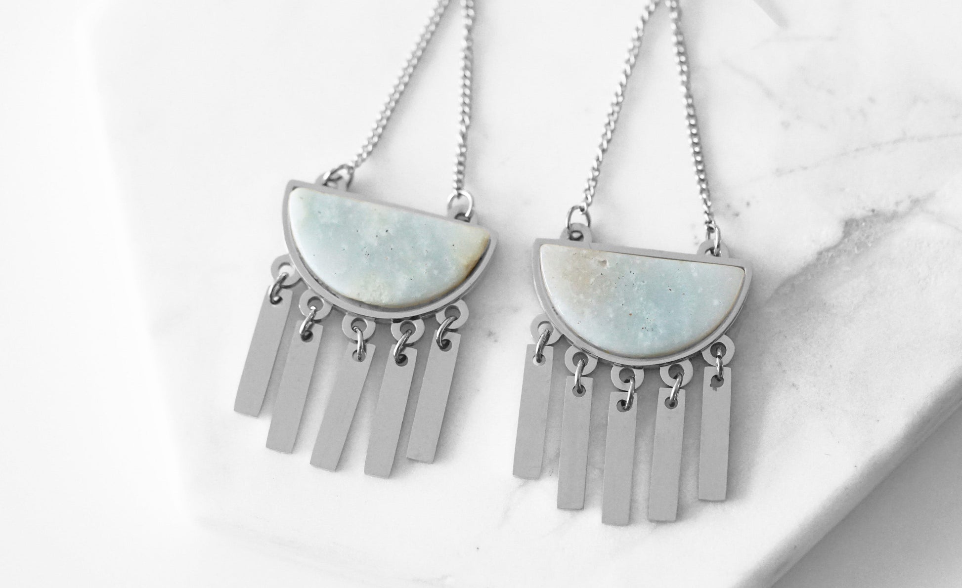 Silver And Light Blue Aztec Bar Fringe Tassel Mediumweight Hypoallergenic Nickel Free Statement Drop Earrings. Custom Amazonite Raw Natural Stone Accents And Designed With Love In Texas. Size 3 Inch Length x 1 Inch Width With Custom Sizing Available On Select Pieces.
