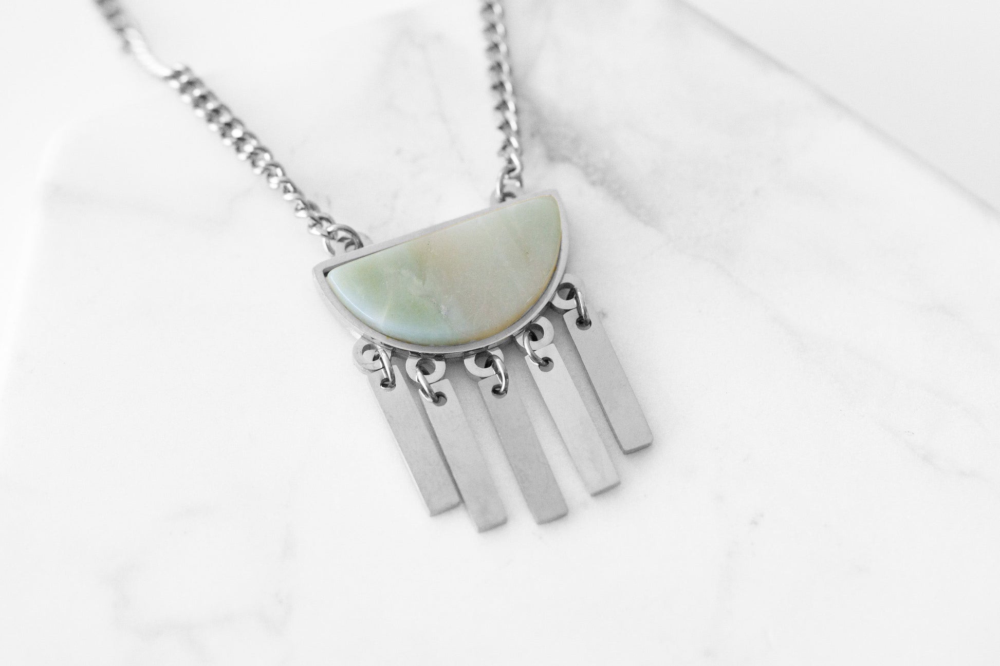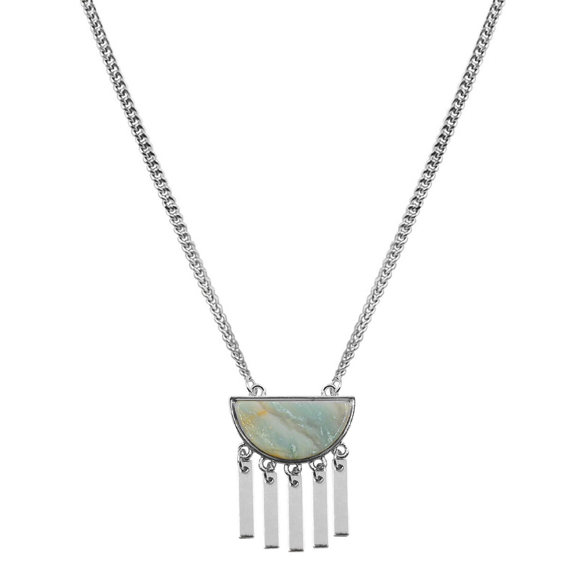 Silver And Light Blue Aztec Bar Fringe Tassel Hypoallergenic Nickel Free Pendant Necklace. Custom Amazonite Raw Natural Stone Accents And Designed With Love In Texas. Size 18, 22, or 26 Inch Length, Plus 3 Inch Attached Necklace Extender With Custom Sizing Available On Select Pieces.