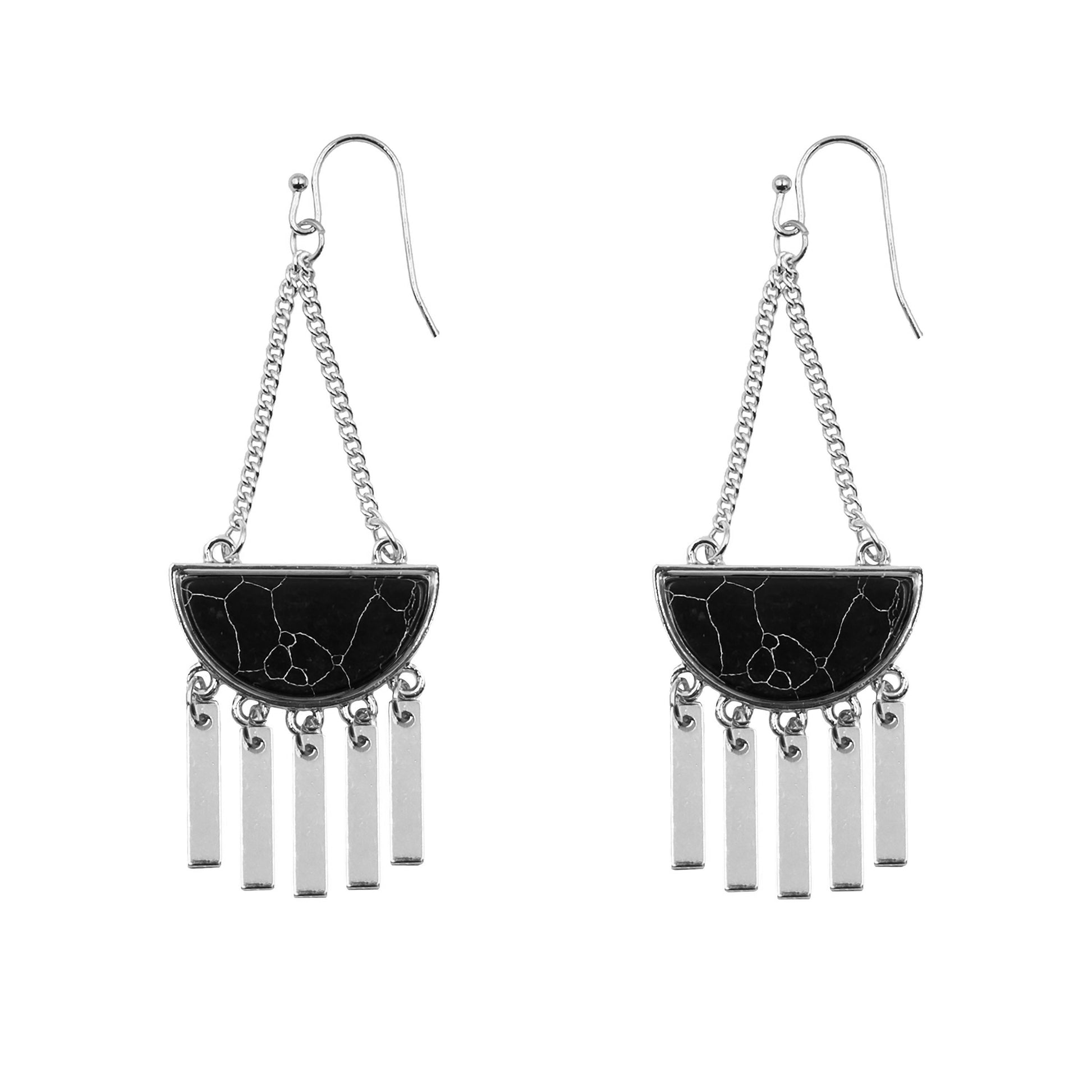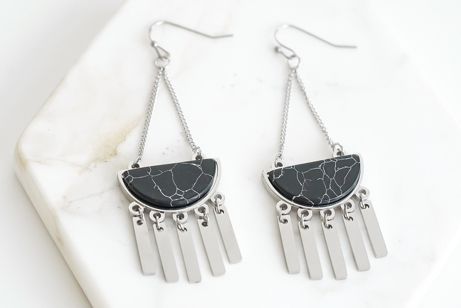Silver And Black Aztec Bar Fringe Tassel Mediumweight Hypoallergenic Nickel Free Statement Drop Earrings. Custom Marquina Raw Natural Stone Accents And Designed With Love In Texas. Size 3 Inch Length x 1 Inch Width With Custom Sizing Available On Select Pieces.