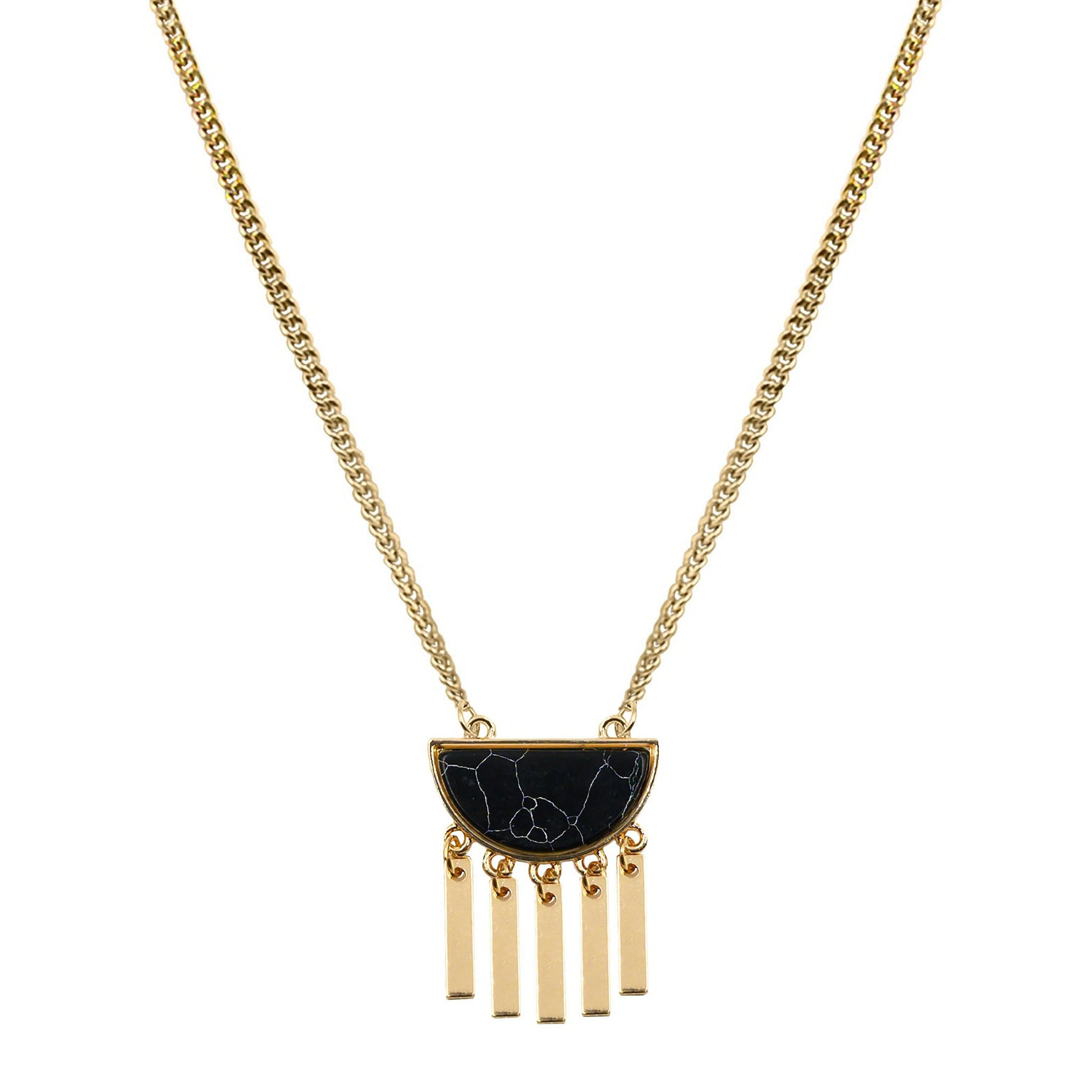 Gold And Black Aztec Bar Fringe Tassel Hypoallergenic Nickel Free Pendant Necklace. Custom Marquina Raw Natural Stone Accents And Designed With Love In Texas. Size 18, 22, or 26 Inch Length, Plus 3 Inch Attached Necklace Extender With Custom Sizing Available On Select Pieces.