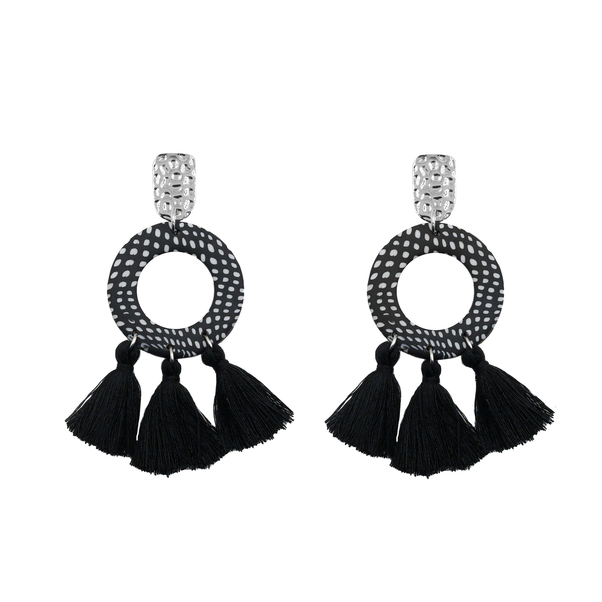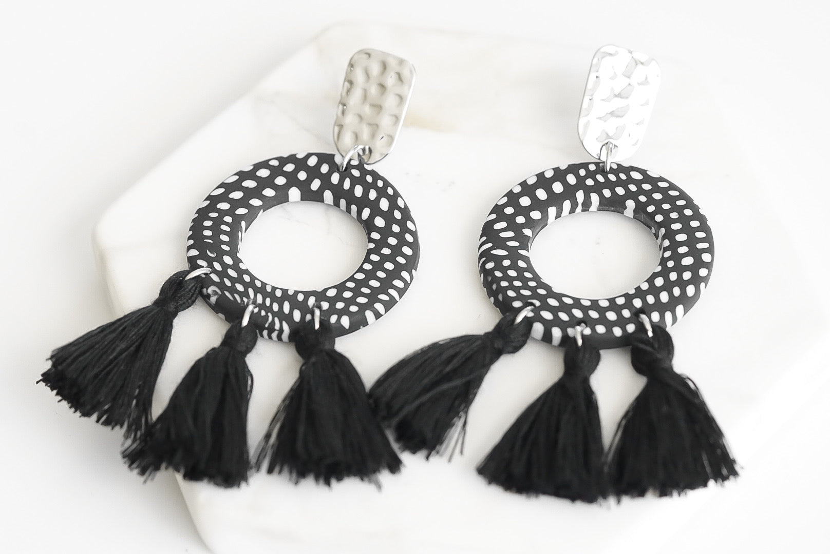 Silver And Black Circle Hammered Polka Dot Stud Tassel Tiered Tropical Lightweight Hypoallergenic Nickel Free Statement Drop Earrings. Custom Clay Geometric Shapes Accents And Designed With Love In Texas. Size 3.5 Inch Length x 1.5 Inch Width With Custom Sizing Available On Select Pieces.
