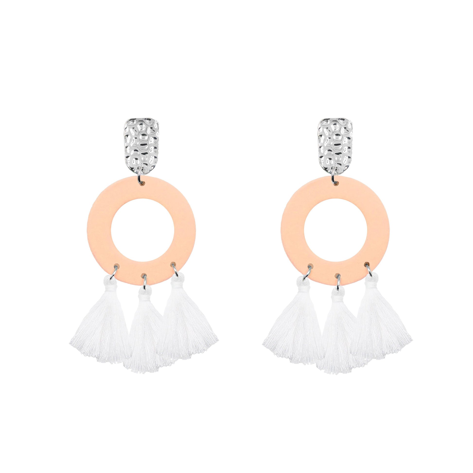 Silver And Orange Hammered Peach Stud Tassel Tropical White Lightweight Hypoallergenic Nickel Free Statement Drop Earrings. Custom Clay Geometric Shapes Accents And Designed With Love In Texas. Size 3.5 Inches Long x 1.5 Inches Wide With Custom Sizing Available On Select Pieces.