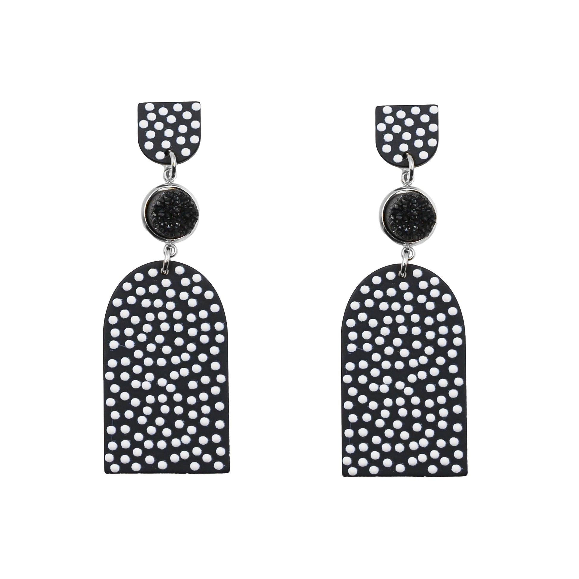 Silver And Black Druzy Polka Dot Tiered Lightweight Hypoallergenic Nickel Free Statement Drop Earrings. Custom Druzy Raw Natural Quartz Stone Accents And Designed With Love In Texas. Size 3 Inch Length x 1 Inch Width With Custom Sizing Available On Select Pieces.