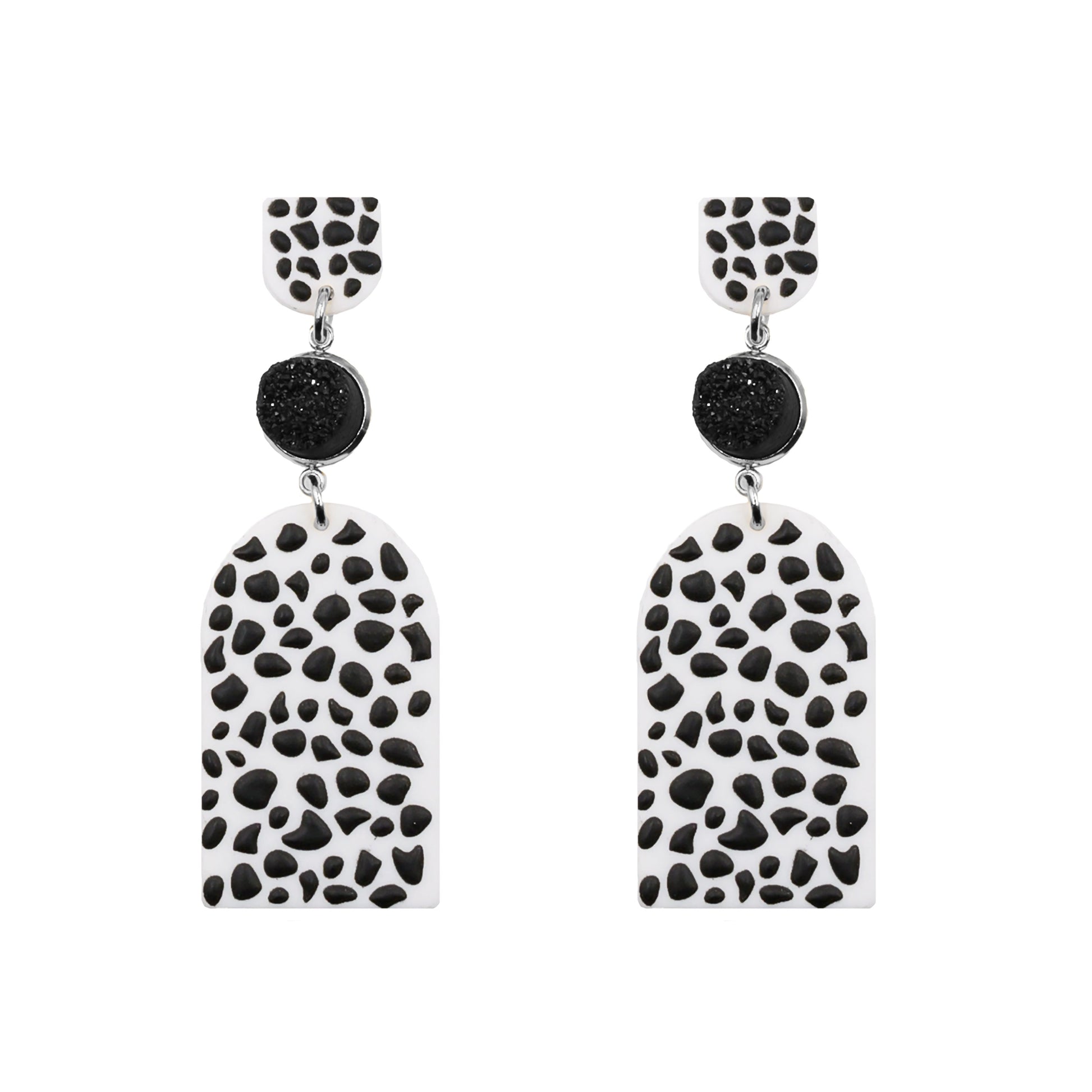 Silver And White Dalmatian Druzy Polka Dot Tiered Lightweight Hypoallergenic Nickel Free Statement Drop Earrings. Custom Druzy Raw Natural Quartz Stone Accents And Designed With Love In Texas. Size 3 Inch Length x 1 Inch Width With Custom Sizing Available On Select Pieces.