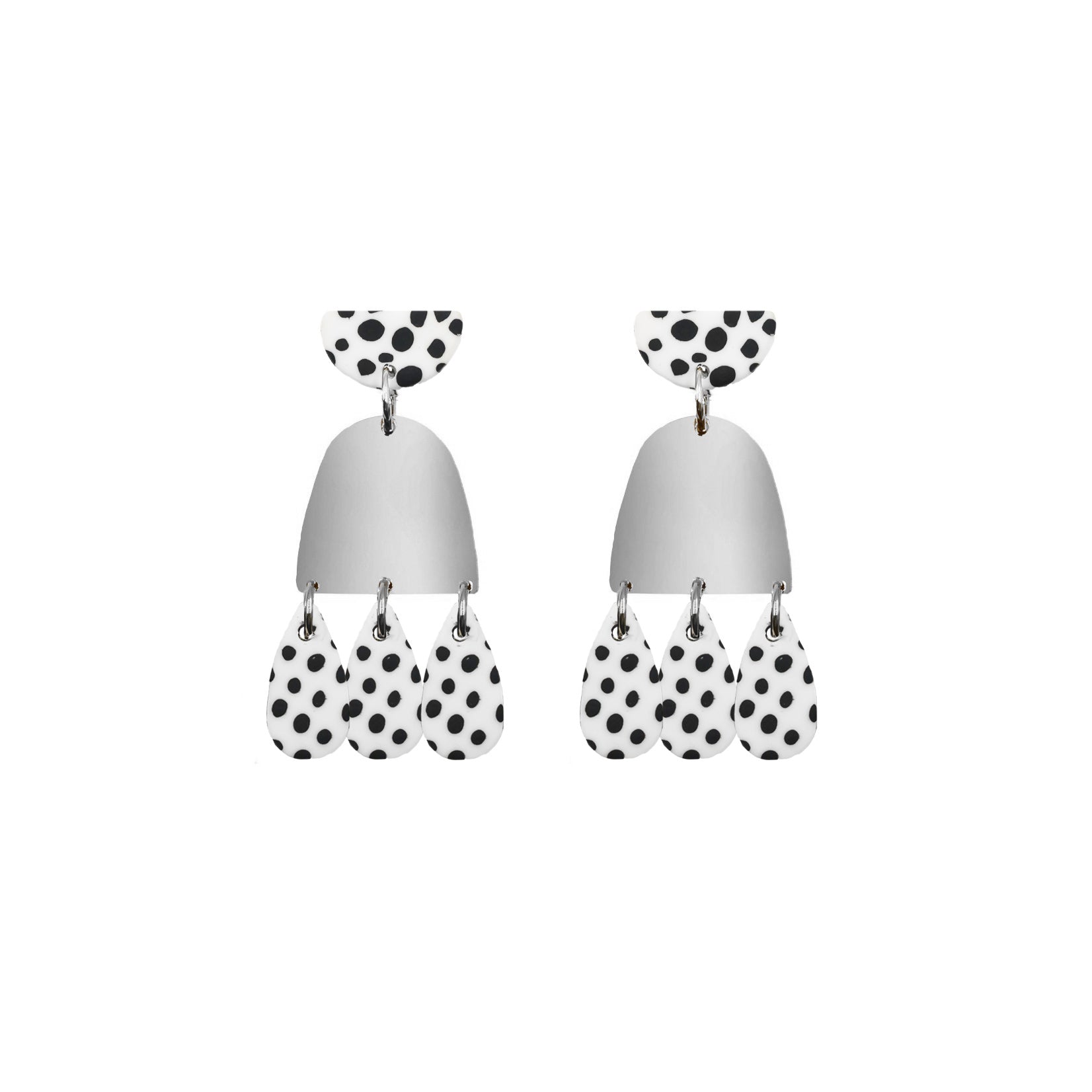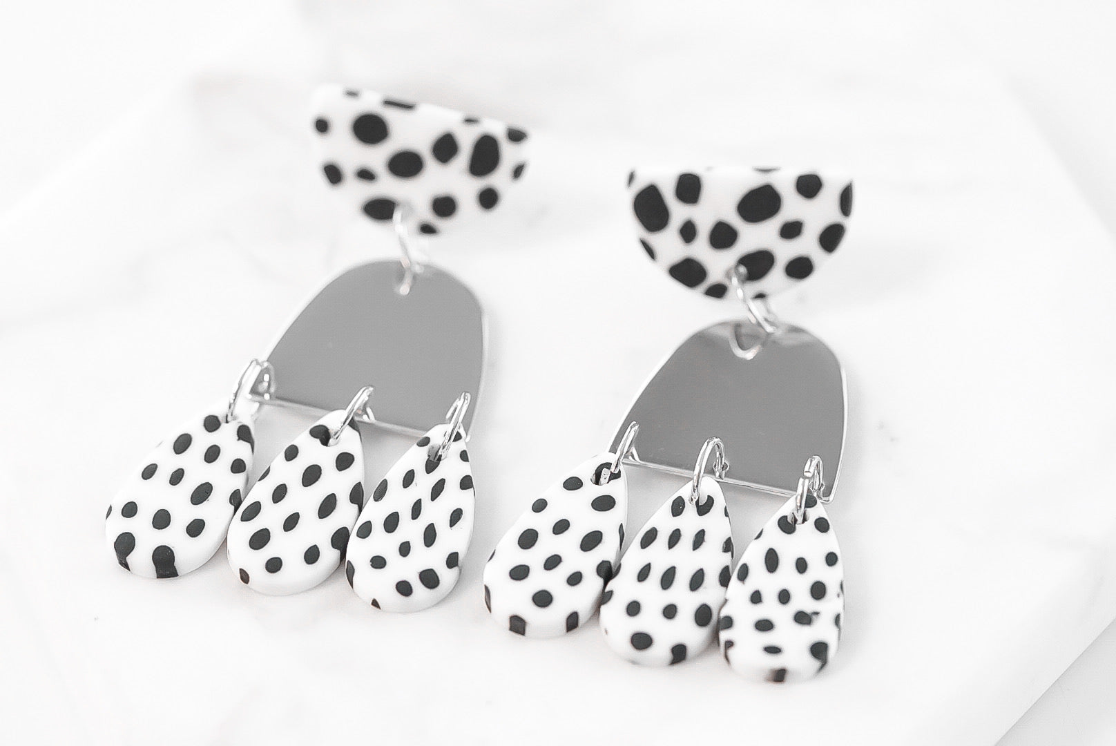 Silver And White Dalmatian Dangle Polka Dot Tear Drop Tiered Lightweight Hypoallergenic Nickel Free Drop Earrings. Custom Clay Geometric Shapes Accents And Designed With Love In Texas. Size 2 Inches Length x 0.75 Inch Width With Custom Sizing Available On Select Pieces.