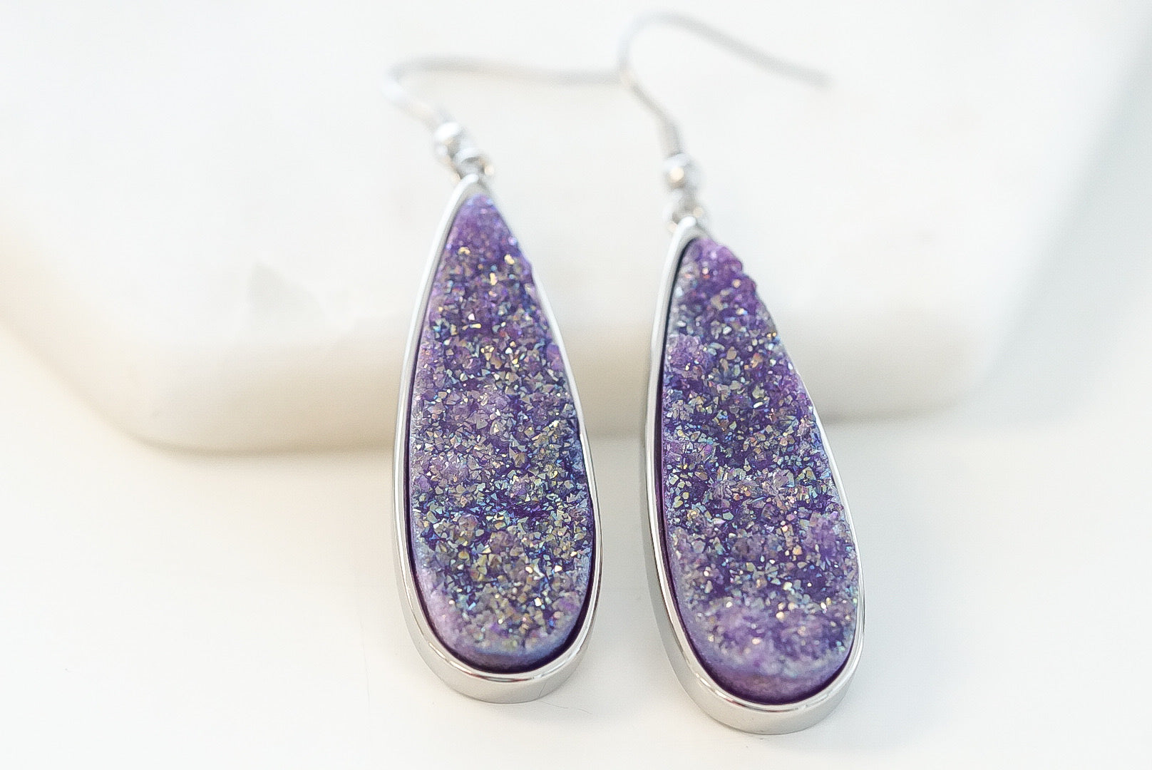 Silver And Purple Mediumweight Hypoallergenic Nickel Free Statement Drop Earrings. Custom Druzy Raw Natural Quartz Stone Accents And Designed With Love In Texas. Size 2.5 Inches Length x 0.5 Inches Width With Custom Sizing Available On Select Pieces.