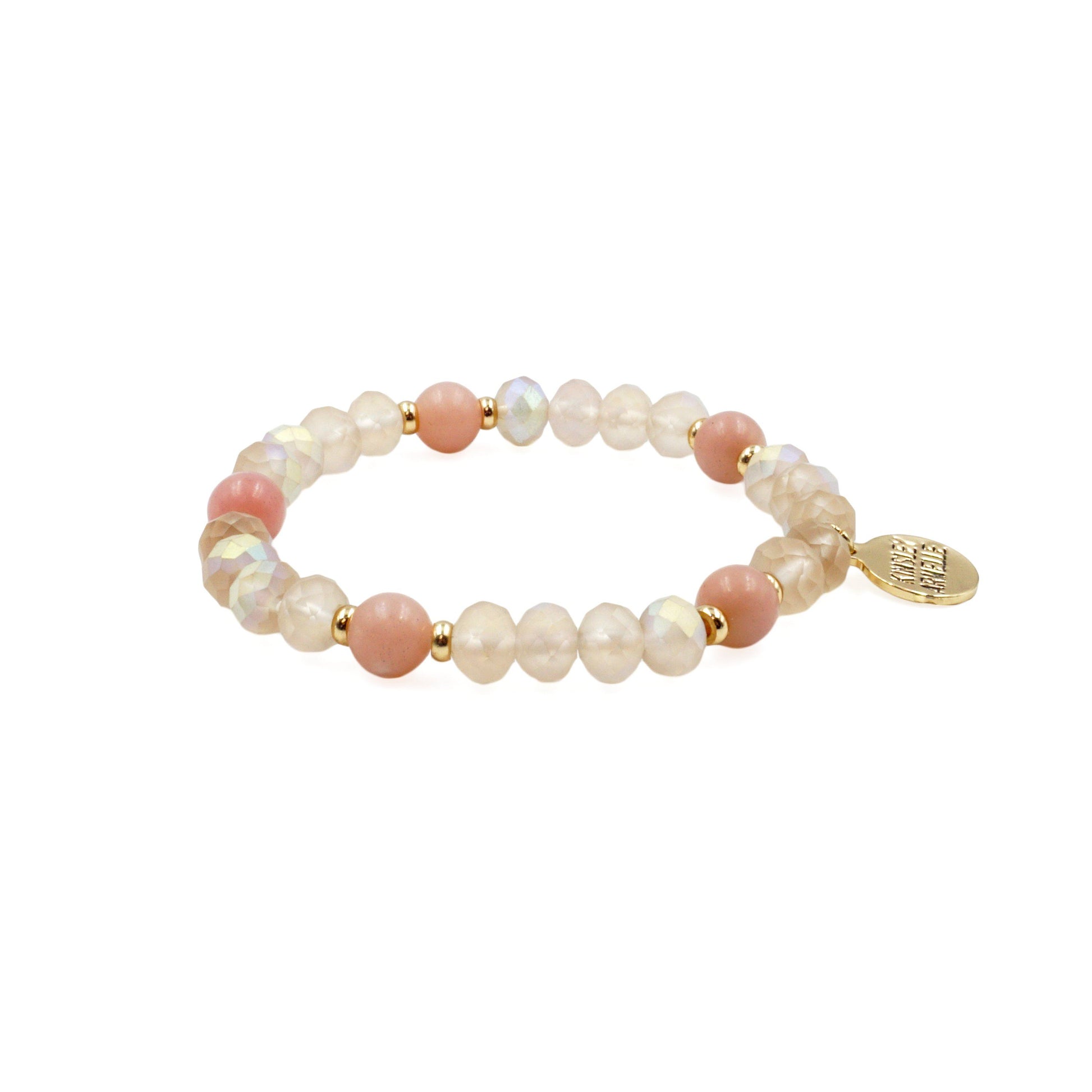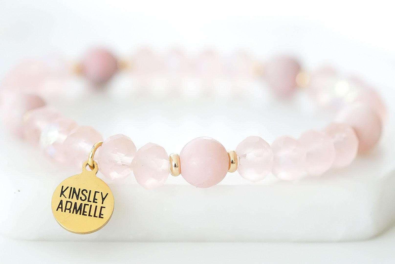 Gold And Pink Glossy Hypoallergenic Nickel Free Beaded Stretch Bracelet. Custom Pink Opal Raw Natural Stone Accents And Designed With Love In Texas. Size Small, Medium, Large, and Extra Large Ranging From 6.25 - 7.25 Inch Circumference With Custom Sizing Available On Select Pieces.