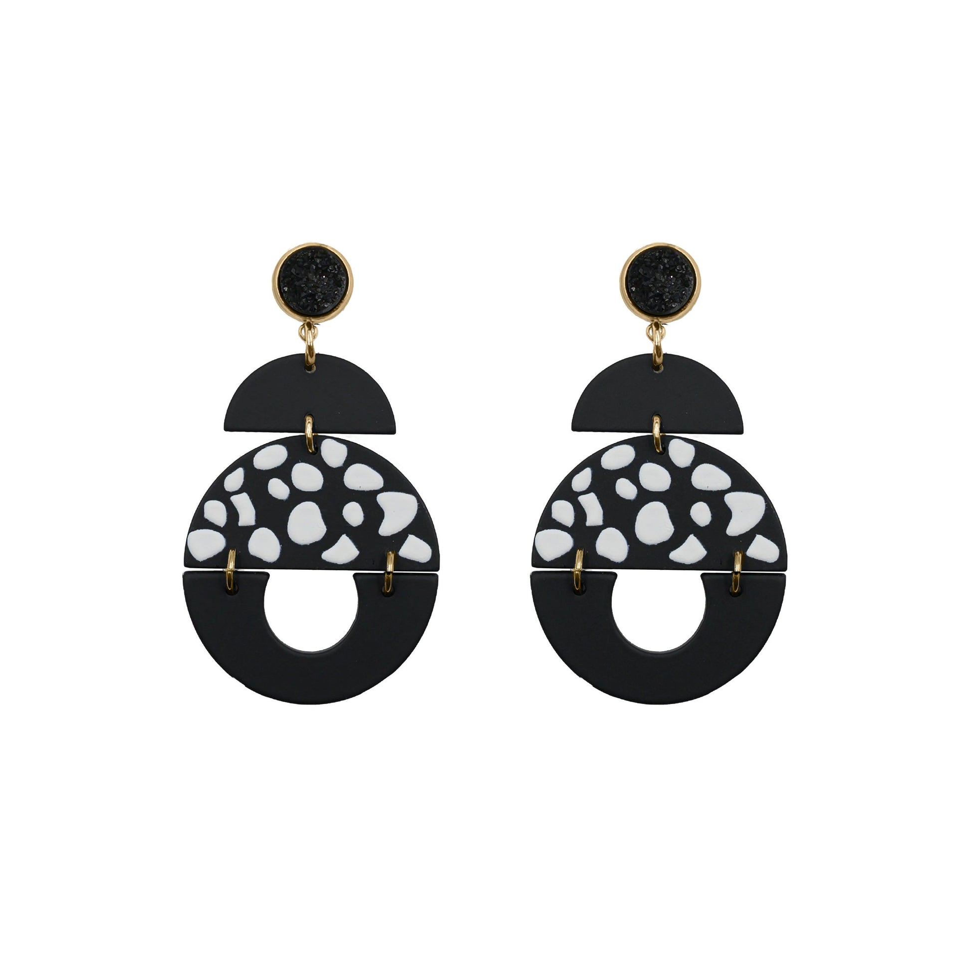 Gold And Black Clay Druzy Natural Stone Polka Dot Raw Stud Tiered Lightweight Hypoallergenic Nickel Free Statement Drop Earrings. Custom Druzy Raw Natural Quartz Stone Accents And Designed With Love In Texas. Size 2.75 Inch Length x 1.5 Inch Width With Custom Sizing Available On Select Pieces.