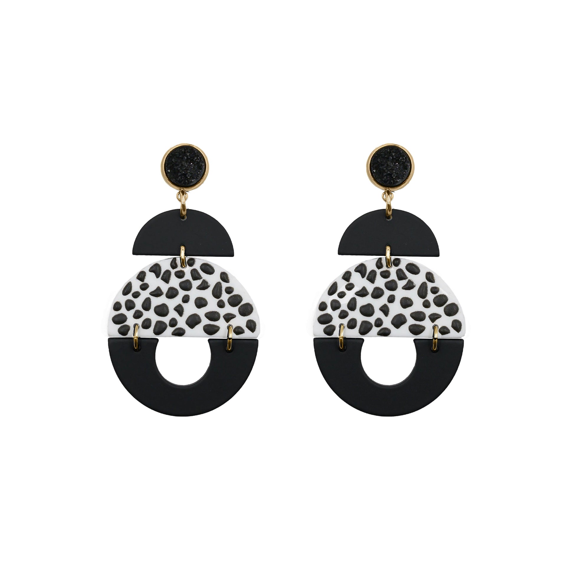Gold And White Clay Dalmatian Druzy Natural Stone Polka Dot Raw Stud Tiered Lightweight Hypoallergenic Nickel Free Statement Drop Earrings. Custom Druzy Raw Natural Quartz Stone Accents And Designed With Love In Texas. Size 2.75 Inch Length x 1.5 Inch Width With Custom Sizing Available On Select Pieces.