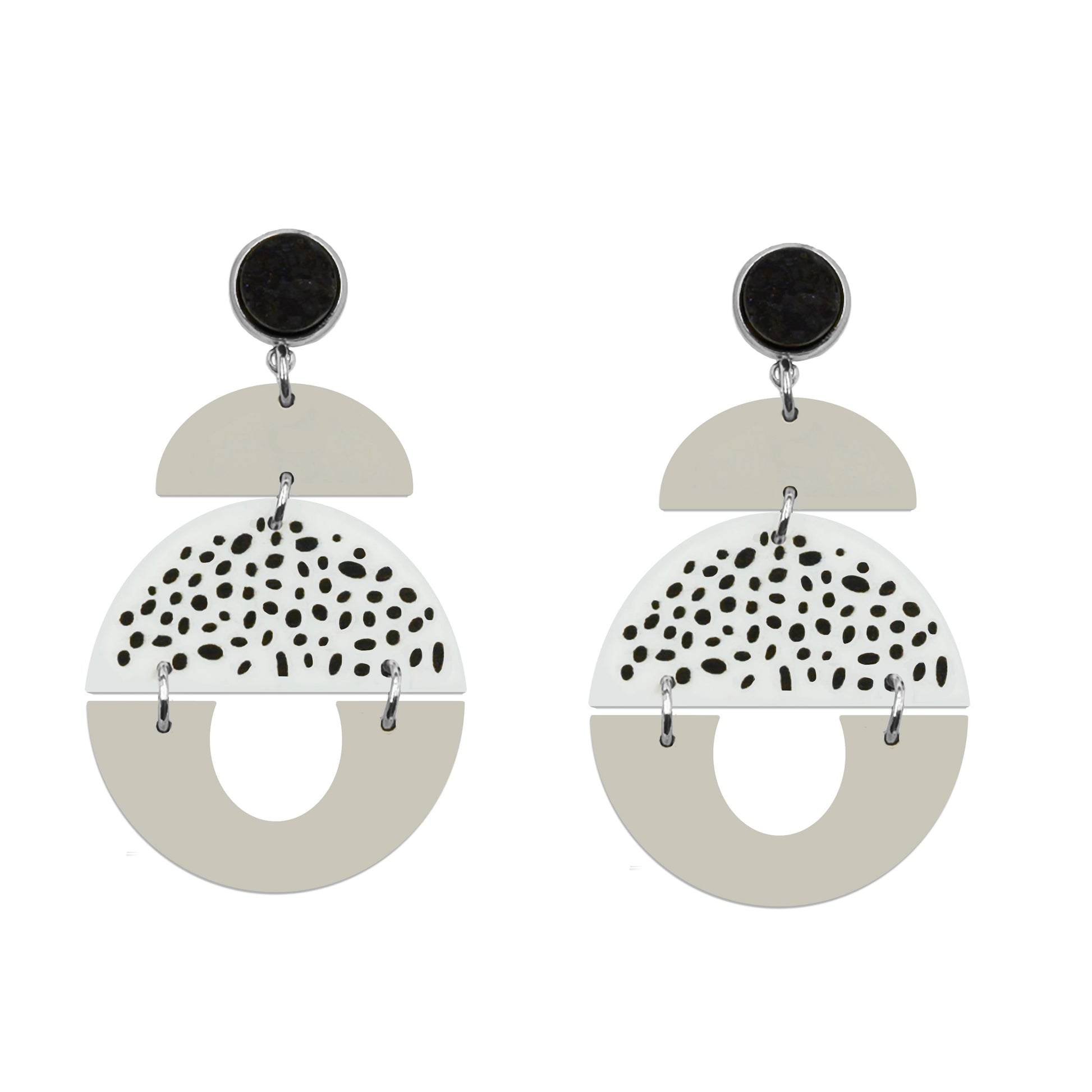Silver And Gray Clay Dalmatian Druzy Natural Stone Polka Dot Raw Stud Tiered Lightweight Hypoallergenic Nickel Free Statement Drop Earrings. Custom Druzy Raw Natural Quartz Stone Accents And Designed With Love In Texas. Size 2.75 Inch Length x 1.5 Inch Width With Custom Sizing Available On Select Pieces.