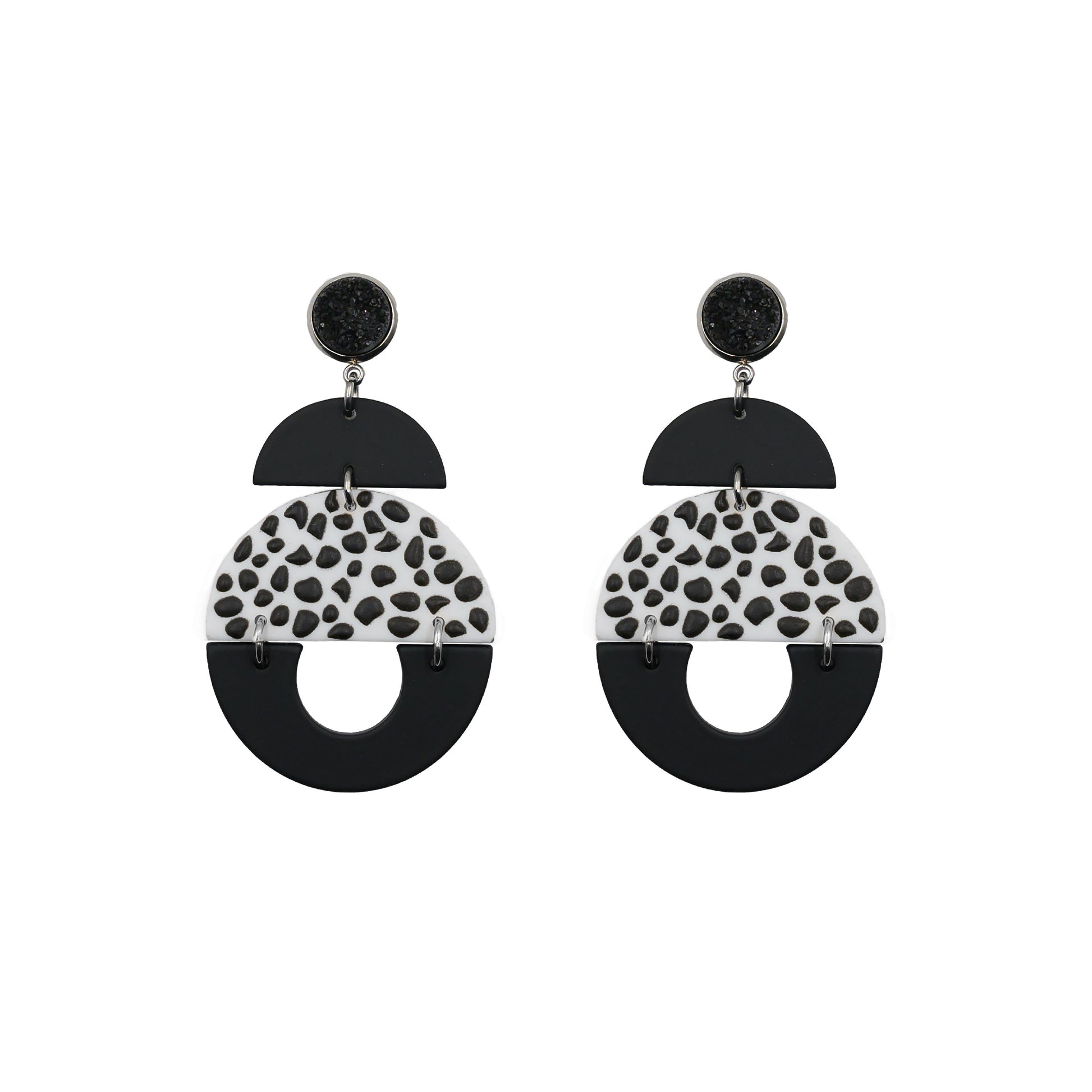 Silver And White Clay Dalmatian Druzy Natural Stone Polka Dot Raw Stud Tiered Lightweight Hypoallergenic Nickel Free Statement Drop Earrings. Custom Druzy Raw Natural Quartz Stone Accents And Designed With Love In Texas. Size 2.75 Inch Length x 1.5 Inch Width With Custom Sizing Available On Select Pieces.