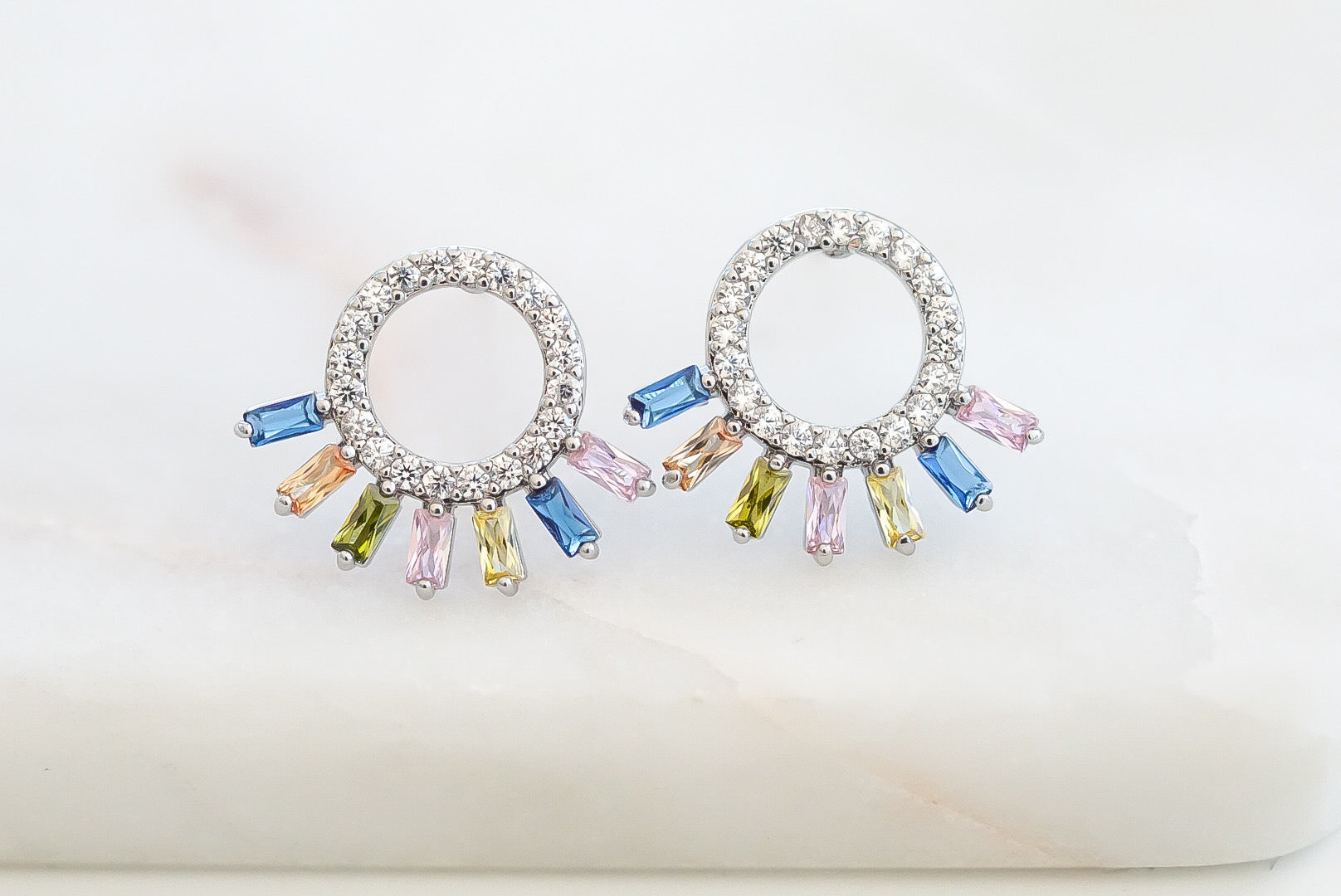 Silver And Gray Inlaid Multicolored Featherweight Hypoallergenic Nickel Free Dainty Stud Earrings. Custom Zircon Gemstones Raw Natural Stone Accents And Designed With Love In Texas. Size 0.5 Inch Wide x 0.5 Inch Length With Custom Sizing Available On Select Pieces.