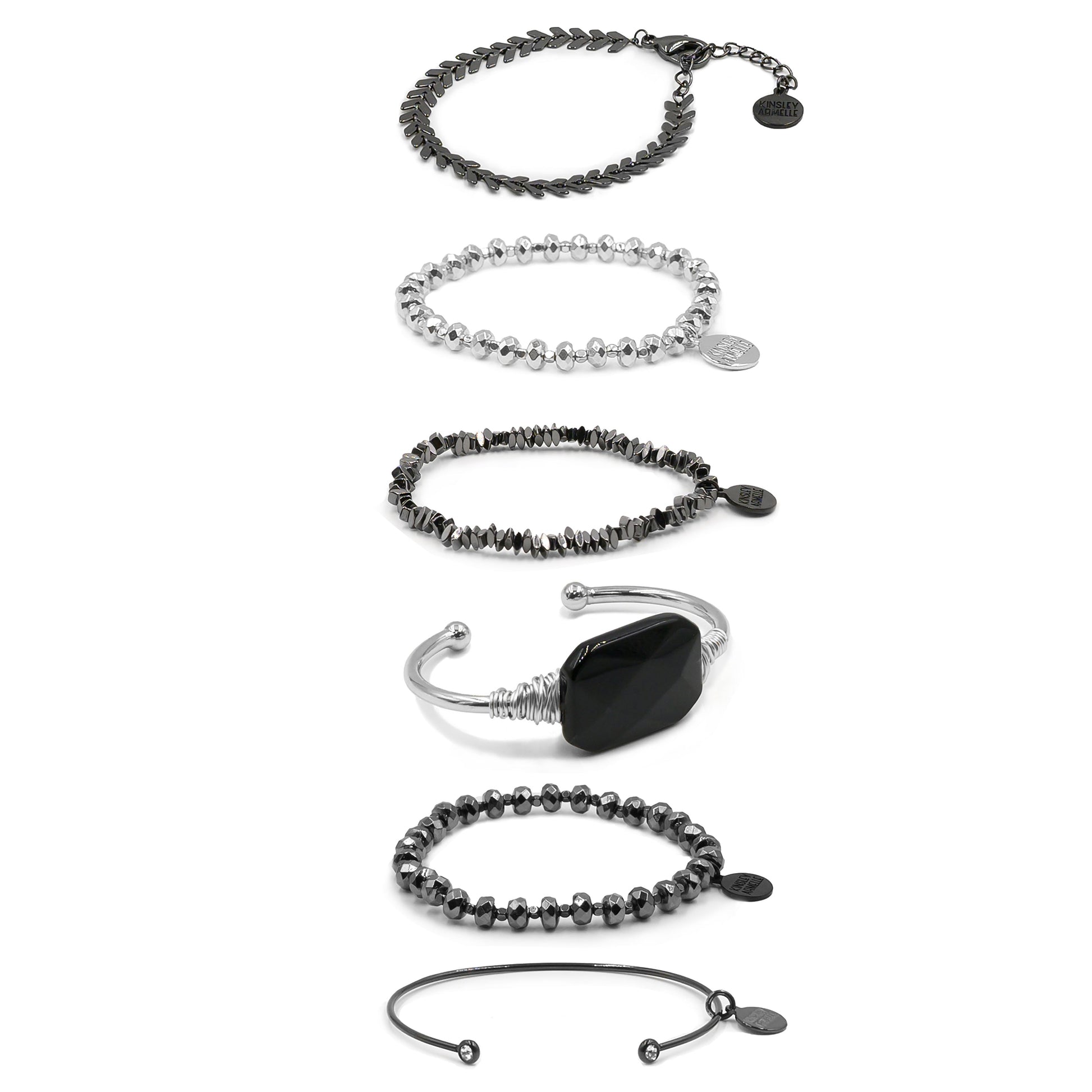 All Black Adjustable Beads Chevron Cubed Herringbone Rhinestone Stackable Wire Wrapped Hypoallergenic Nickel Free Bracelet Stack Set. Custom Black Obsidian Raw Natural Stone Accents And Designed With Love In Texas. Size Small, Medium, Large, and Extra Large Ranging From 6.25 - 7.25 Inch Circumference With Custom Sizing Available On Select Pieces.