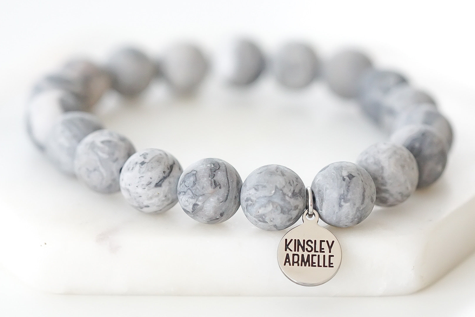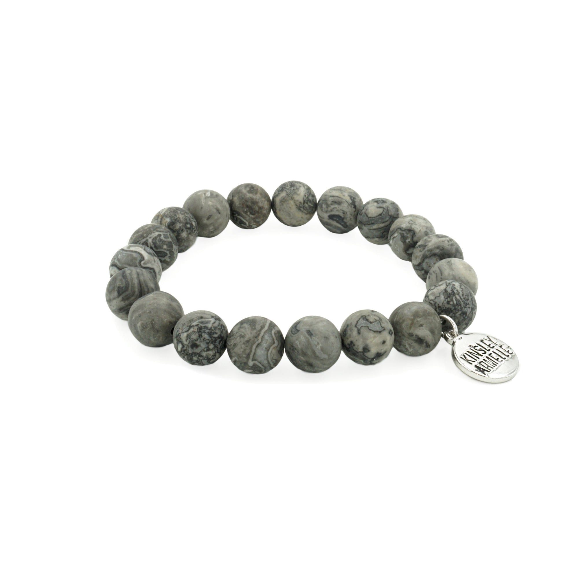 Silver And Gray Marble Hypoallergenic Nickel Free Beaded Stretch Bracelet. Custom Silver Ion Plated Stainless Steel Charm Accents And Designed With Love In Texas. Size Small, Medium, Large, and Extra Large Ranging From 6.25 - 7.25 Inch Circumference With Custom Sizing Available On Select Pieces.