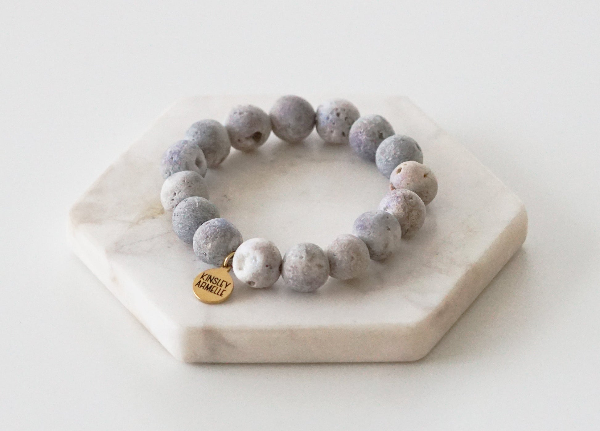 White And Gray Druzy Geode Pocks Natural Stone Raw Hypoallergenic Nickel Free Beaded Stretch Bracelet. Custom Charm Accents And Designed With Love In Texas. Size Small, Medium, Large, and Extra Large Ranging From 6.25 - 7.25 Inch Circumference With Custom Sizing Available On Select Pieces.