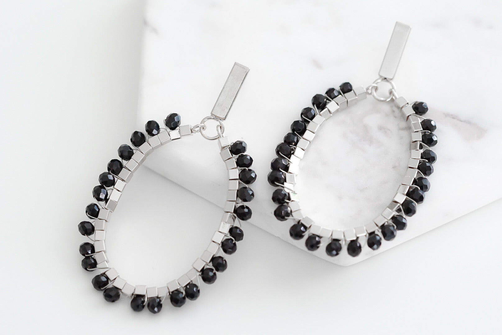 Silver And Black Beads Faceted Hoop Stud Mediumweight Hypoallergenic Nickel Free Statement Drop Earrings. Custom Decorative Accent Beads Accents And Designed With Love In Texas. Size 2.5 Inches Length x 1.5 Inches Width With Custom Sizing Available On Select Pieces.
