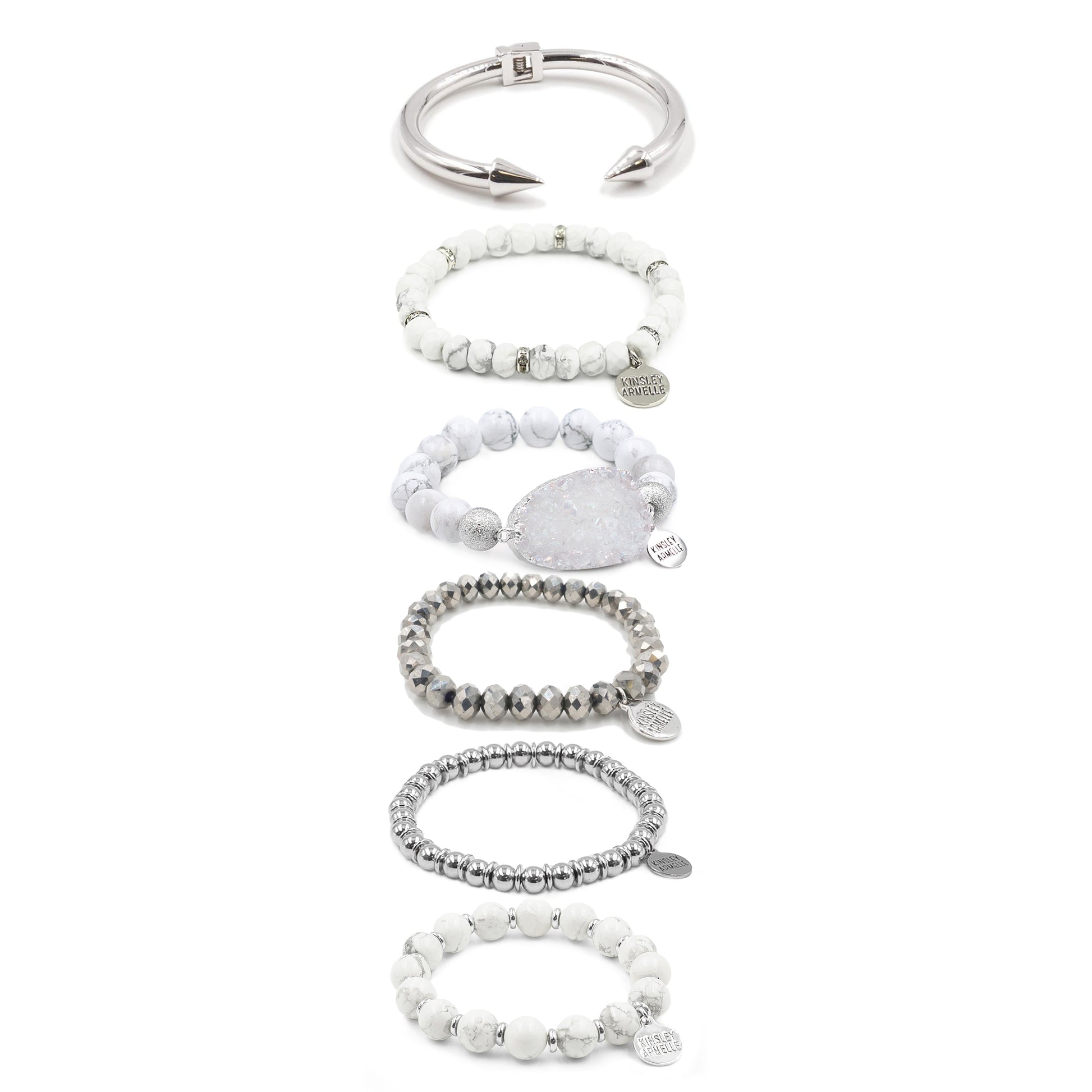 Silver And White Beads Cuff Hinged Point Raw Spike Stackable Hypoallergenic Nickel Free Bracelet Stack Set. Custom Druzy Raw Natural Quartz Stone Accents And Designed With Love In Texas. Size Small, Medium, Large, and Extra Large Ranging From 6.25 - 7.25 Inch Circumference With Custom Sizing Available On Select Pieces.