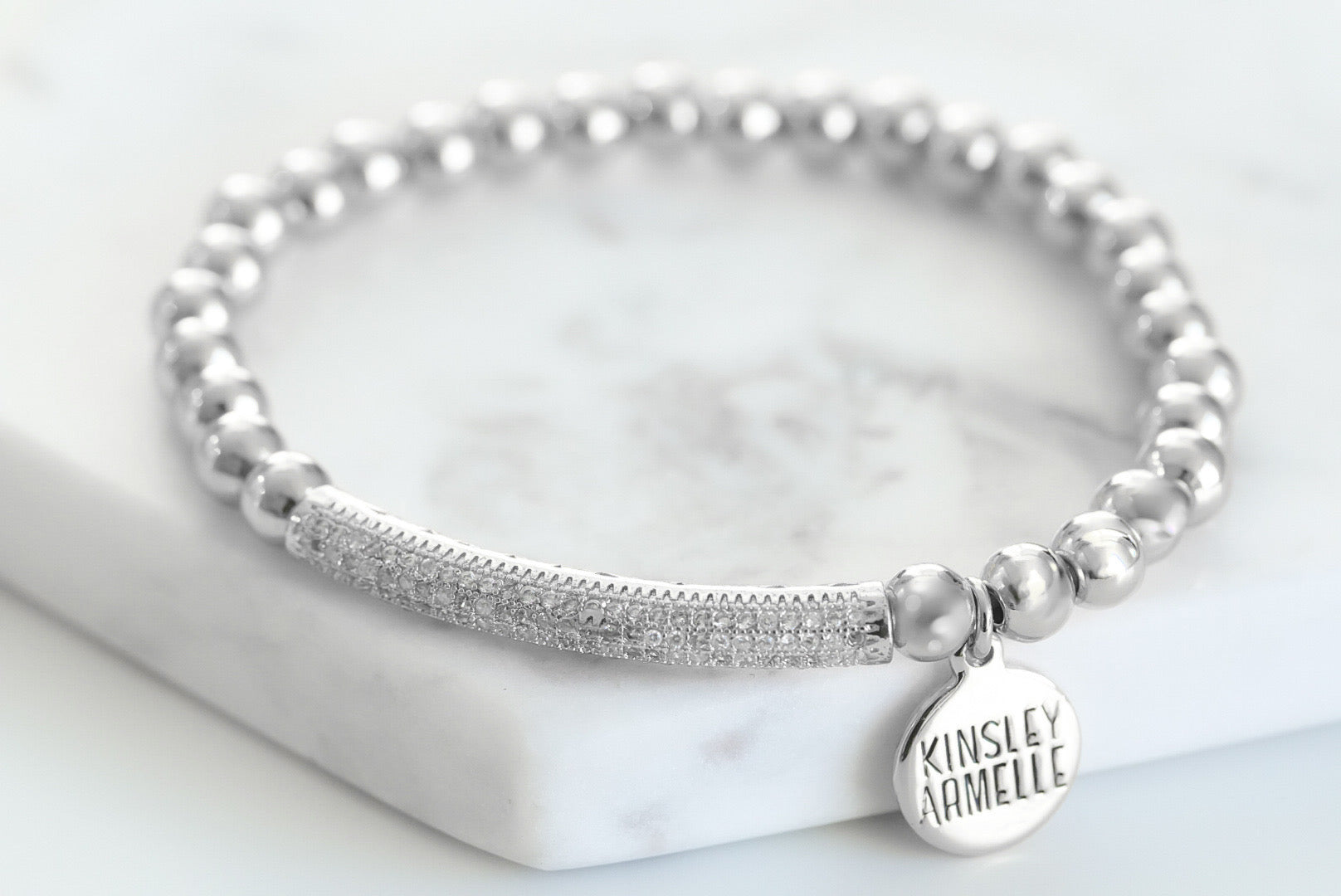 Silver And Gray Pave Hypoallergenic Nickel Free Beaded Stretch Bracelet. Custom Zircon Gemstones Pave Rhinestone Bar Accents And Designed With Love In Texas. Size Small, Medium, Large, and Extra Large Ranging From 6.25 - 7.25 Inch Circumference With Custom Sizing Available On Select Pieces.