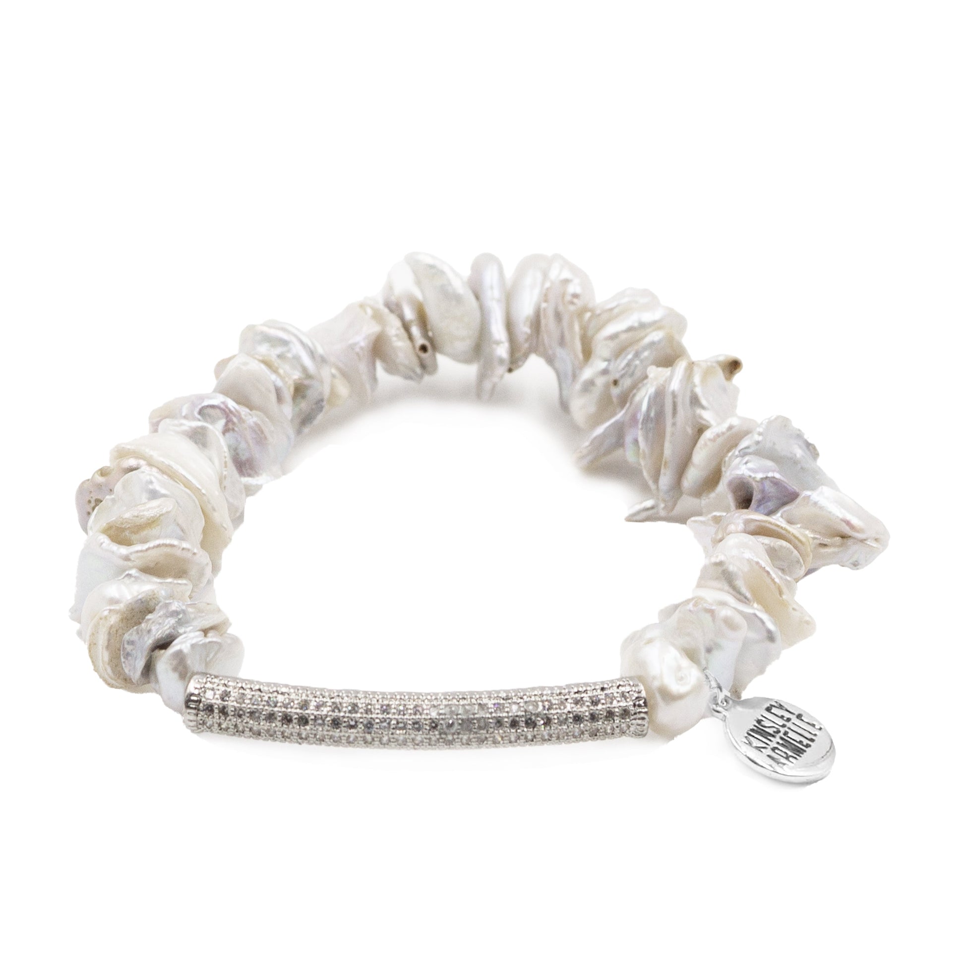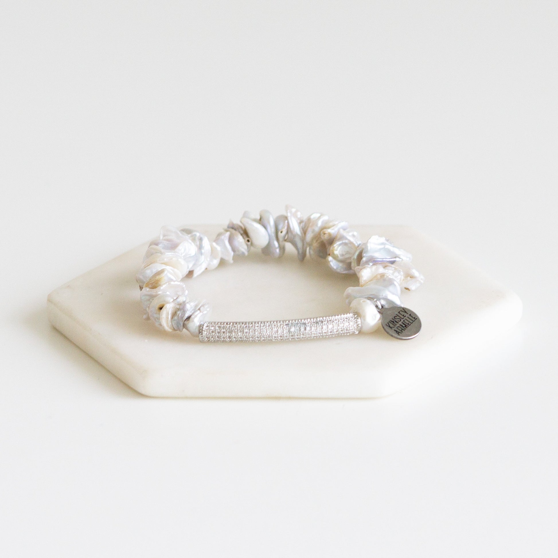 Silver And Gray Chip Natural Stone Pave Shell Hypoallergenic Nickel Free Beaded Stretch Bracelet. Custom Zircon Gemstones Pave Rhinestone Bar Accents And Designed With Love In Texas. Size Small, Medium, Large, and Extra Large Ranging From 6.25 - 7.25 Inch Circumference With Custom Sizing Available On Select Pieces.