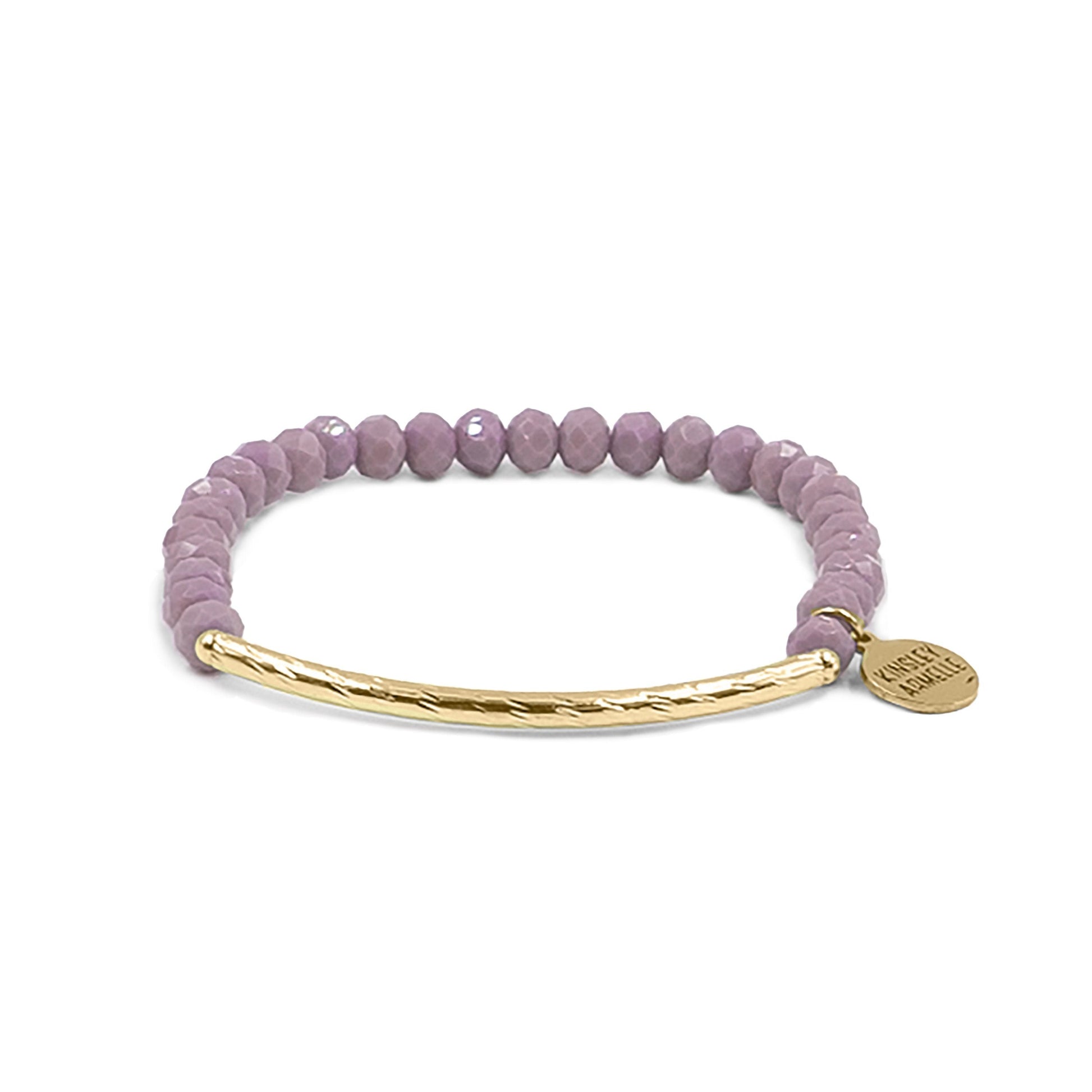Gold And Purple Faceted Beaded Stretch Bracelet. Custom 18K Yellow Gold Plated Brass Hammered Bar Accents And Designed With Love In Texas. Size Small, Medium, Large, and Extra Large Ranging From 6.25 - 7.25 Inch Circumference With Custom Sizing Available On Select Pieces.