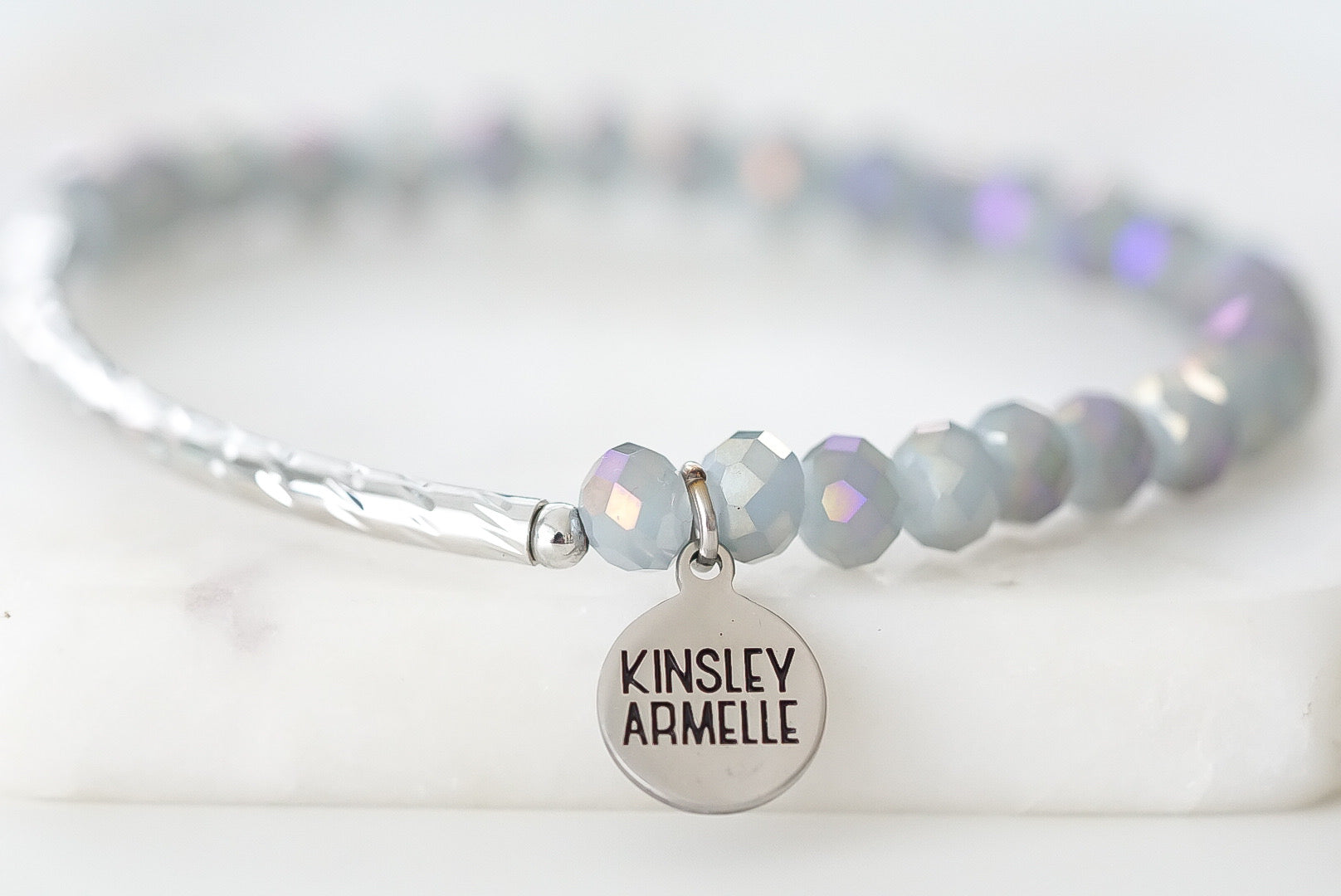 Silver And Blue Faceted Iridescent Multicolored Beaded Stretch Bracelet. Custom Silver Plated Brass Hammered Bar Accents And Designed With Love In Texas. Size Small, Medium, Large, and Extra Large Ranging From 6.25 - 7.25 Inch Circumference With Custom Sizing Available On Select Pieces.
