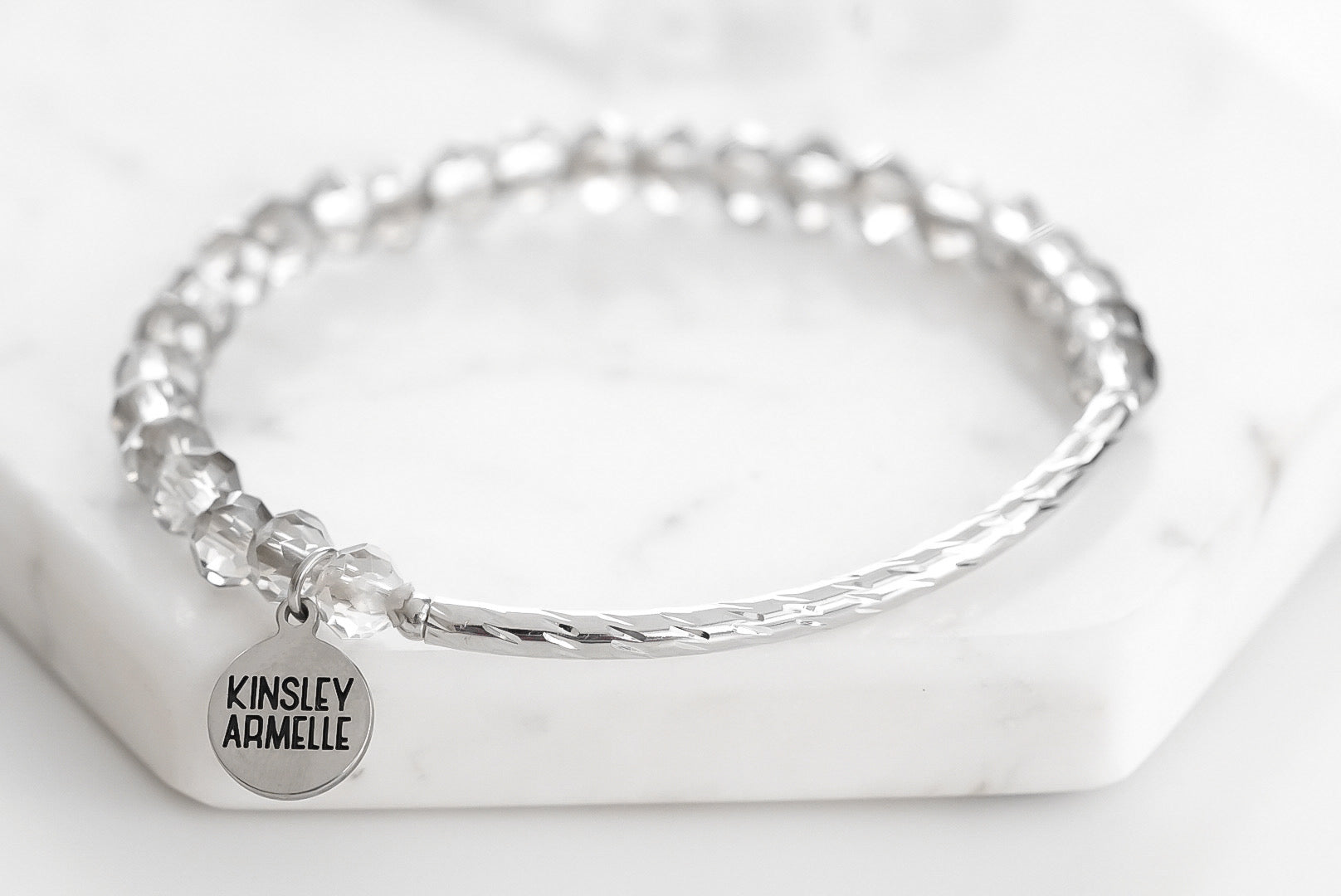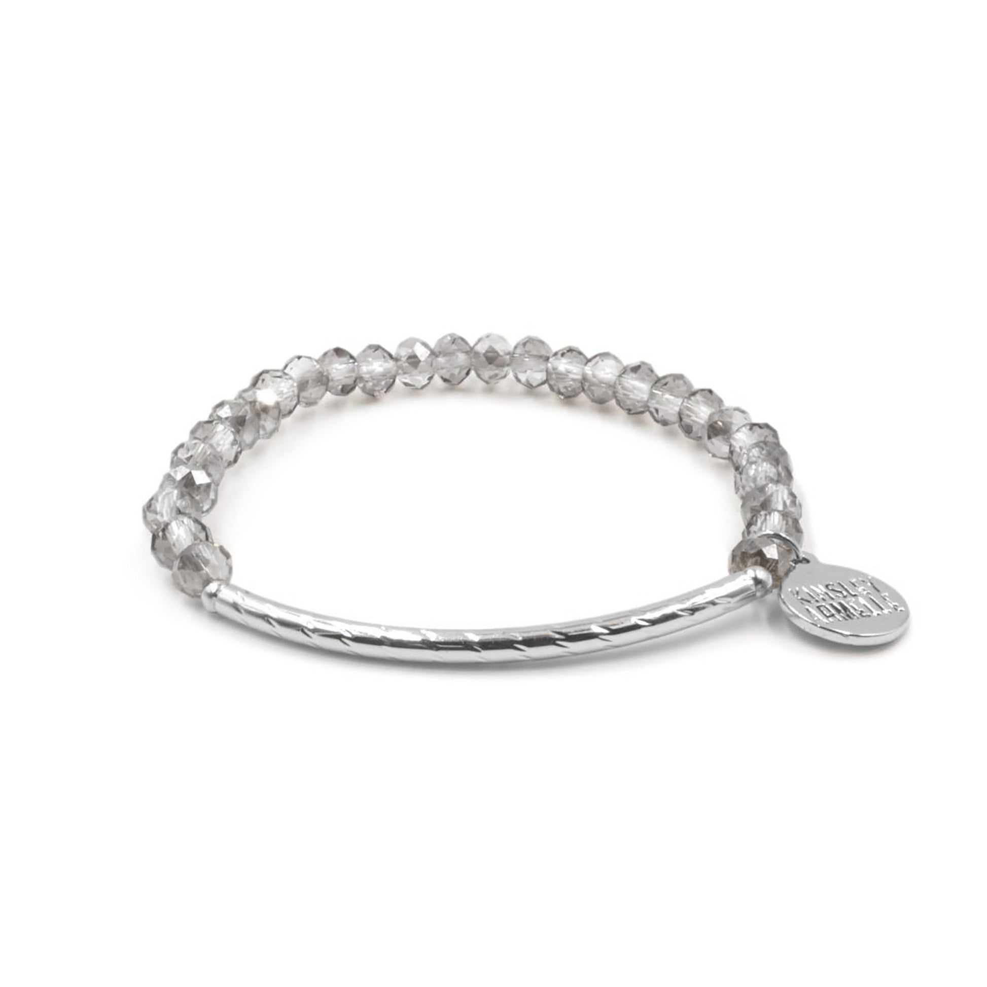Silver And Gray Clear Faceted Beaded Stretch Bracelet. Custom Silver Plated Brass Hammered Bar Accents And Designed With Love In Texas. Size Small, Medium, Large, and Extra Large Ranging From 6.25 - 7.25 Inch Circumference With Custom Sizing Available On Select Pieces.