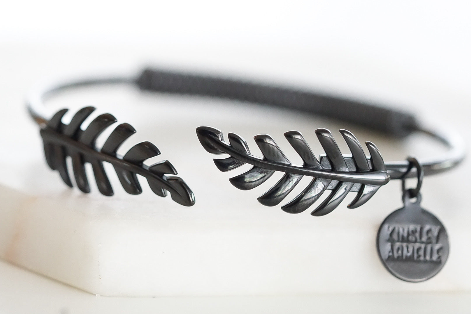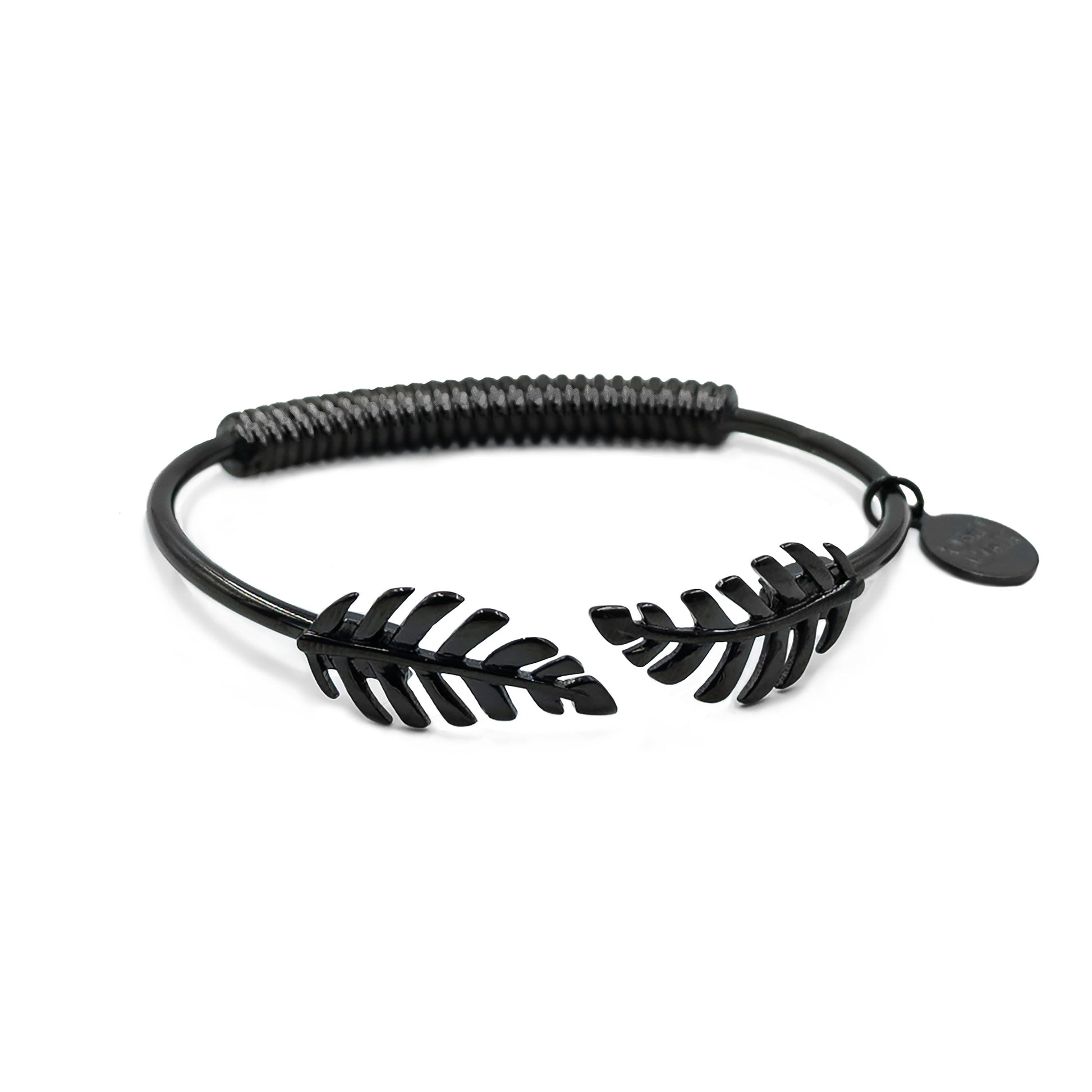 Black Hinged Leaf Feather Hypoallergenic Nickel Free All Metal Bangle Cuff Bracelet. Custom Black Ion Plated Stainless Steel Charm Accents And Designed With Love In Texas. Size Small, Medium, Large, and Extra Large Ranging From 6.25 - 7.25 Inch Circumference With Custom Sizing Available On Select Pieces.