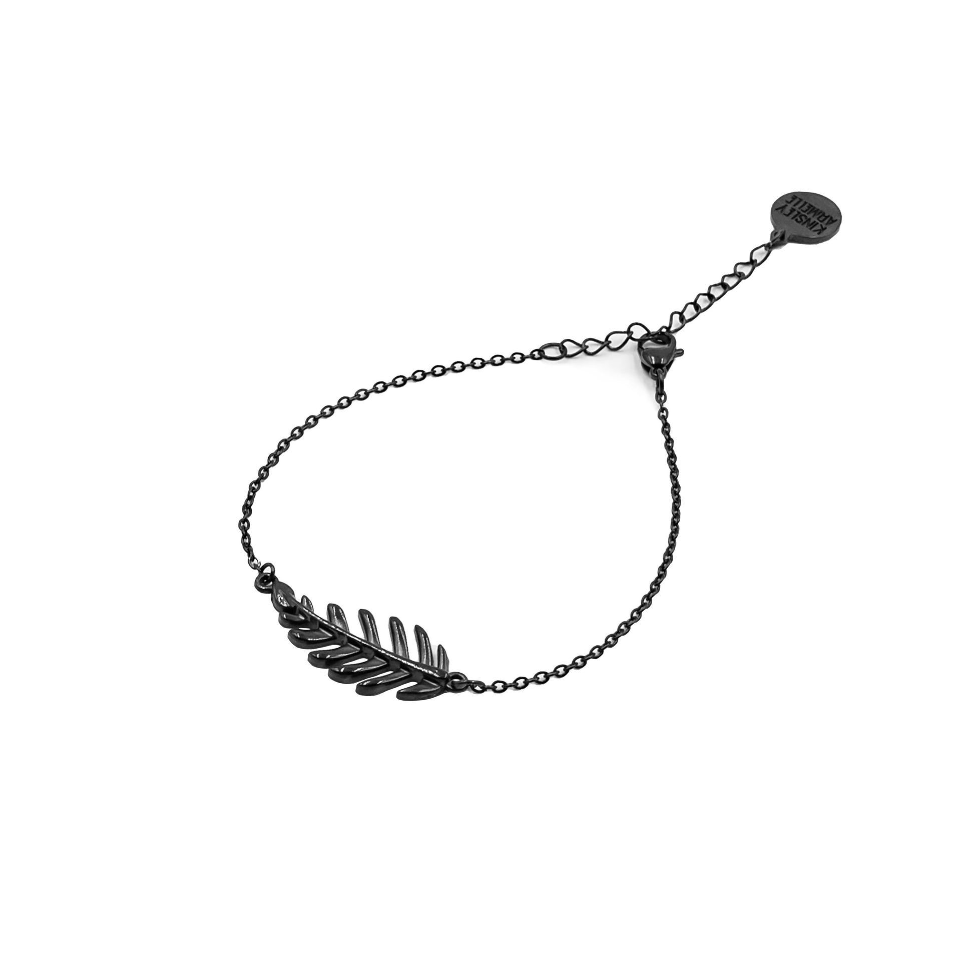 All Black Clasp Leaf Feather Hypoallergenic Nickel Free Dainty Adjustable Bracelet. Custom Geometric Shapes Accents And Designed With Love In Texas. Size 7.0 - 8.75 Inch Circumference With Custom Sizing Available On Select Pieces.