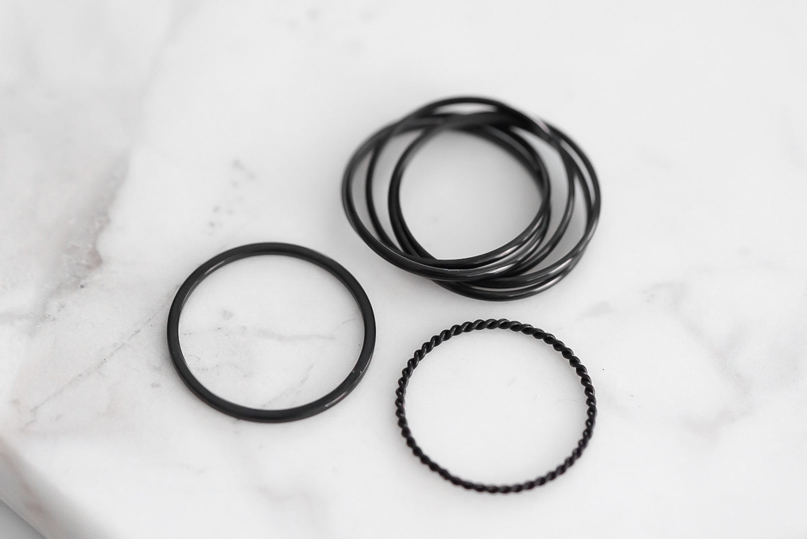 All Black Coil Twisted Hypoallergenic Nickel Free Dainty Ring Stack Set. Custom Geometric Shapes Accents And Designed With Love In Texas. Size 5 - 10 With Custom Sizing Available On Select Pieces.