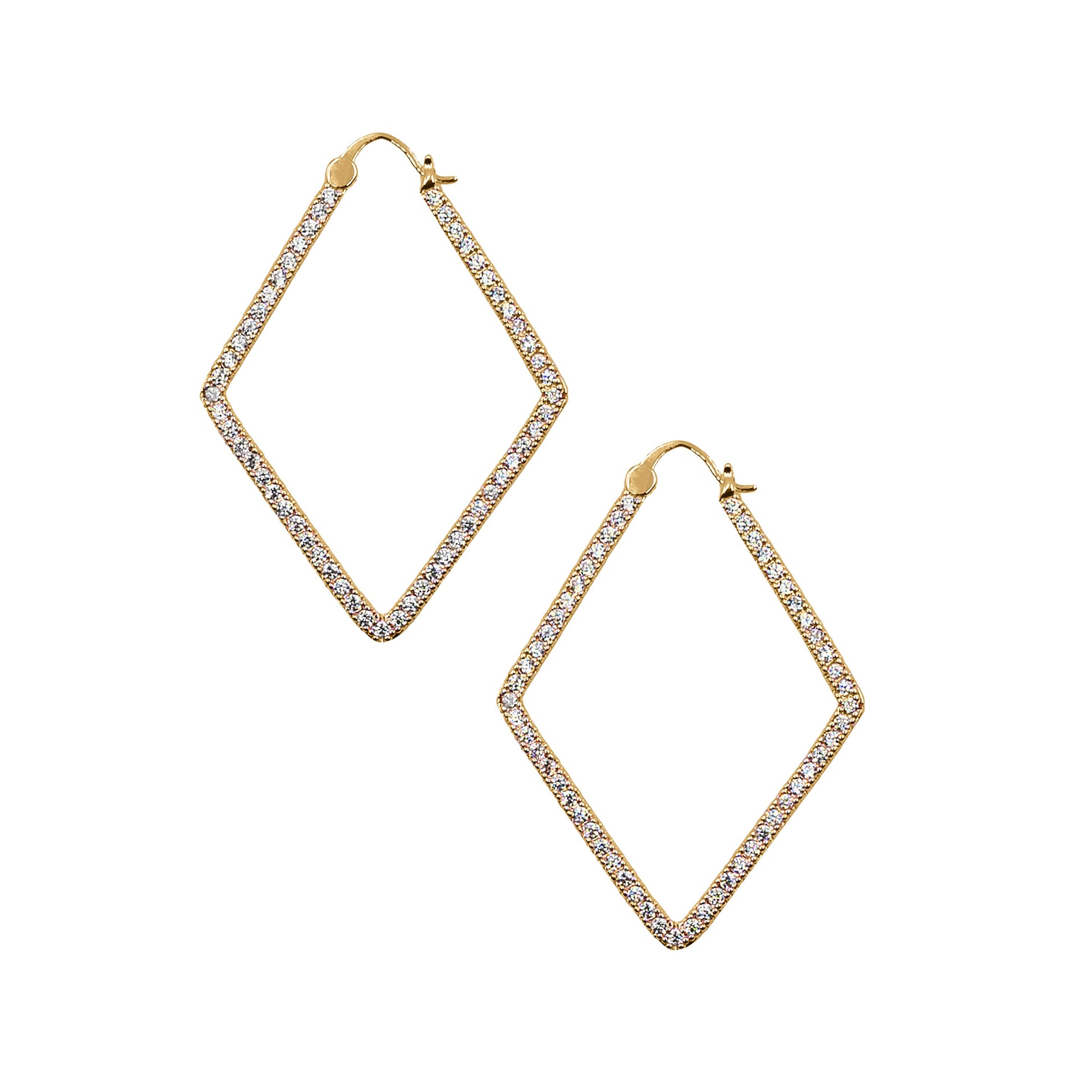 Gold And White Diamond Geometric Inlaid Pave Lightweight Hypoallergenic Nickel Free Hoop Earrings. Custom Zircon Gemstones Pave Rhinestones Accents And Designed With Love In Texas. Size 2 Inch Length x 1.5 Inch Width With Custom Sizing Available On Select Pieces.