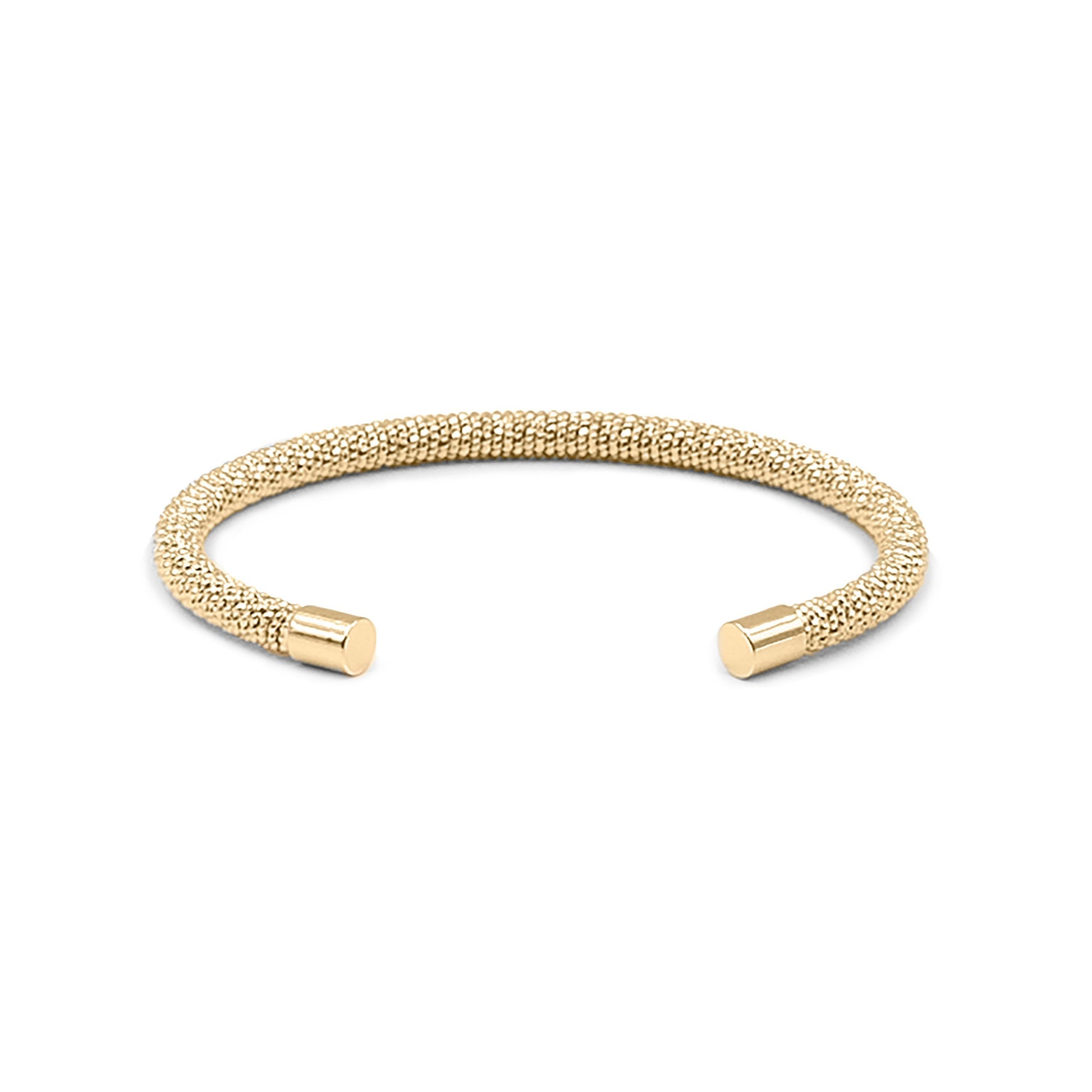 Gold Shimmering Textured All Metal Bangle Cuff Bracelet. Custom Kinsley Armelle Engraved Logo Accents And Designed With Love In Texas. Size Small, Medium, Large, and Extra Large Ranging From 6.25 - 7.25 Inch Circumference With Custom Sizing Available On Select Pieces.