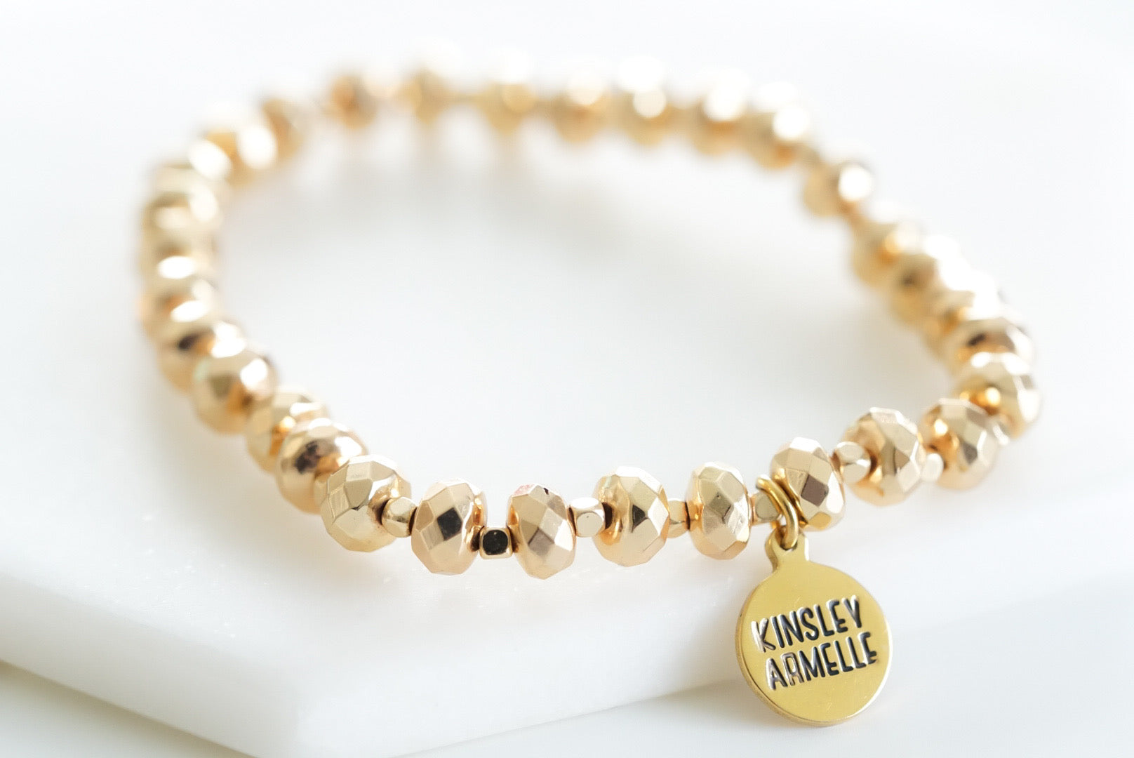 Gold Faceted All Metal Beaded Stretch Bracelet. Custom Charm Accents And Designed With Love In Texas. Size Small, Medium, Large, and Extra Large Ranging From 6.25 - 7.25 Inch Circumference With Custom Sizing Available On Select Pieces.