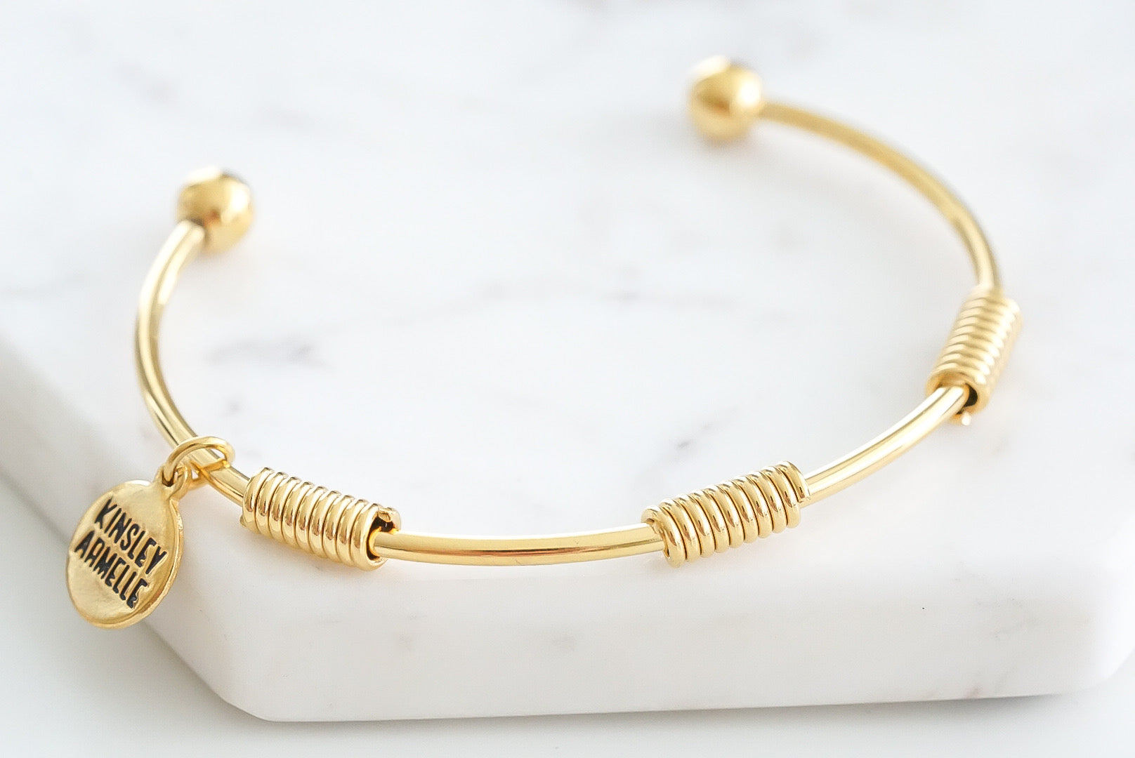 Gold And White Barbed Wire Coil Hypoallergenic Nickel Free Dainty Bangle Cuff Bracelet. Custom Geometric Shapes Accents And Designed With Love In Texas. Size Small, Medium, Large, and Extra Large Ranging From 6.25 - 7.25 Inch Circumference With Custom Sizing Available On Select Pieces.
