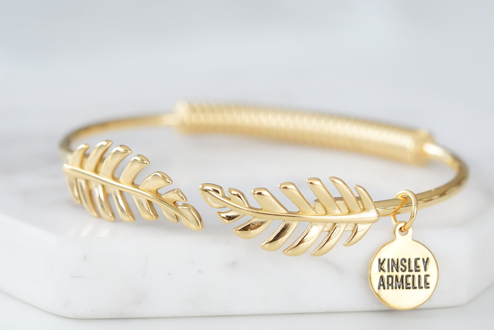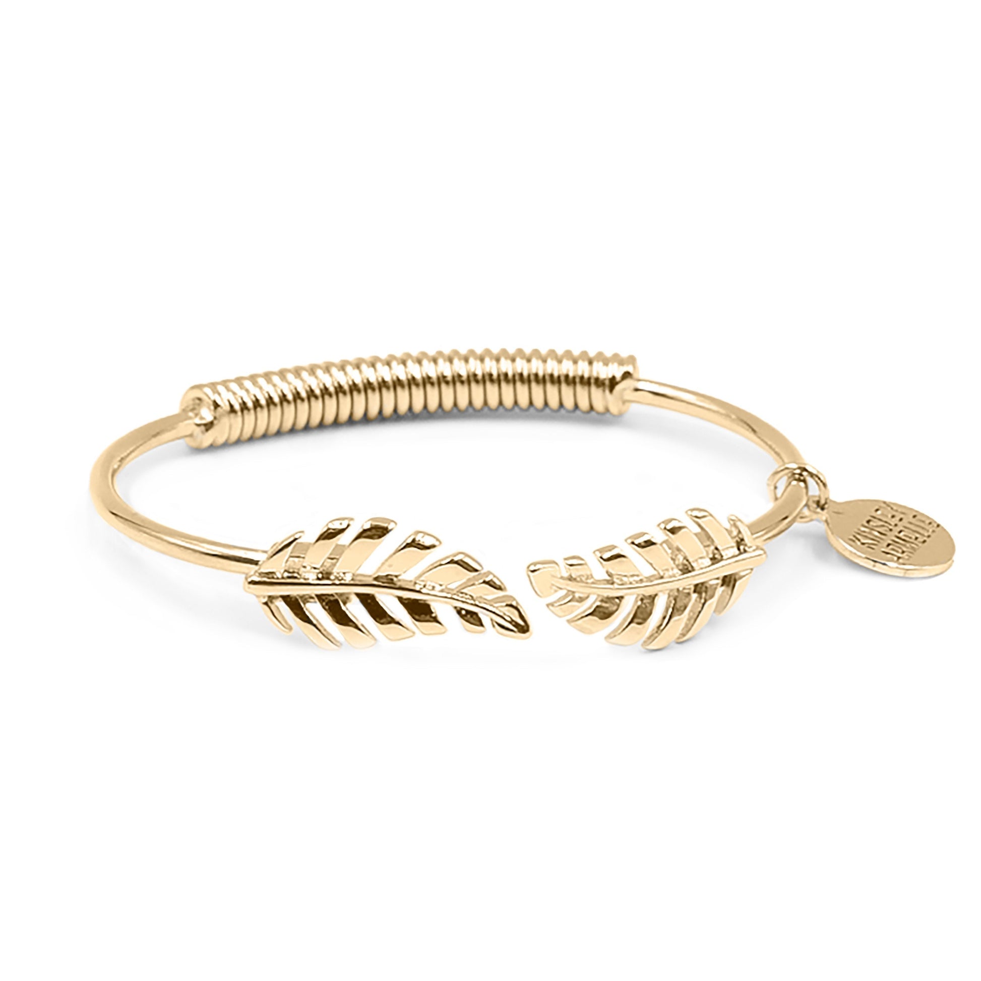 Gold Hinged Leaf Feather Hypoallergenic Nickel Free All Metal Bangle Cuff Bracelet. Custom 18K Yellow Gold Ion Plated Stainless Steel Charm Accents And Designed With Love In Texas. Size Small, Medium, Large, and Extra Large Ranging From 6.25 - 7.25 Inch Circumference With Custom Sizing Available On Select Pieces.
