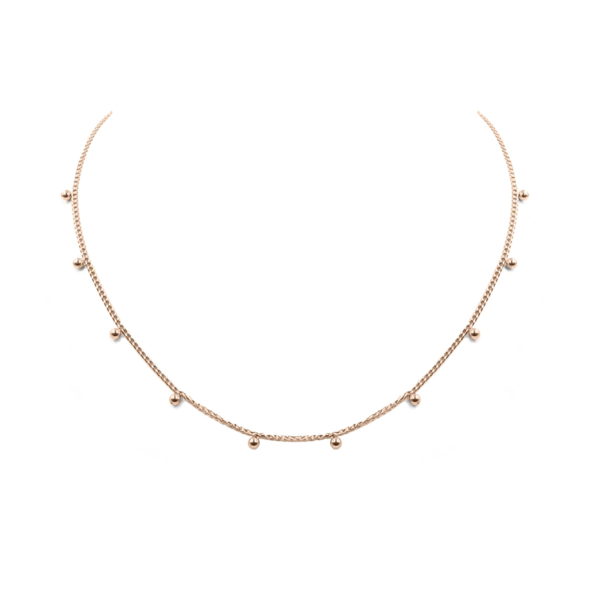 Rose Gold And Pink Ball Station Hypoallergenic Nickel Free Dainty Choker Necklace. Custom Decorative Accent Beads Accents And Designed With Love In Texas. Size 14 or 18 Inch Length, Plus 3 Inch Attached Necklace Extender With Custom Sizing Available On Select Pieces.