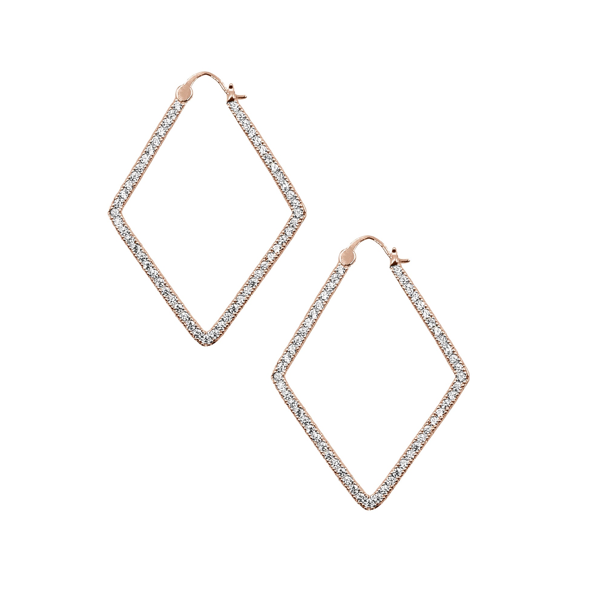 Rose Gold And Pink Diamond Geometric Inlaid Pave Lightweight Hypoallergenic Nickel Free Hoop Earrings. Custom Zircon Gemstones Pave Rhinestones Accents And Designed With Love In Texas. Size 2 Inch Length x 1.5 Inch Width With Custom Sizing Available On Select Pieces.